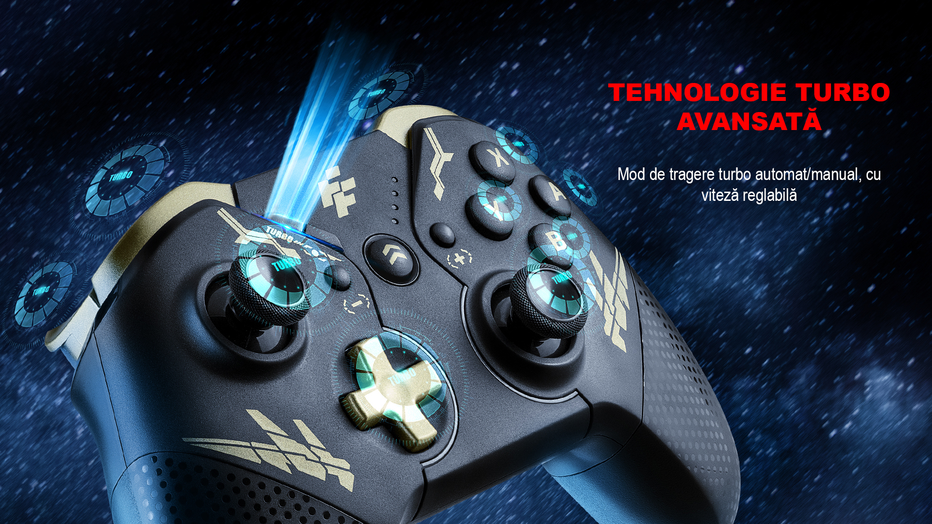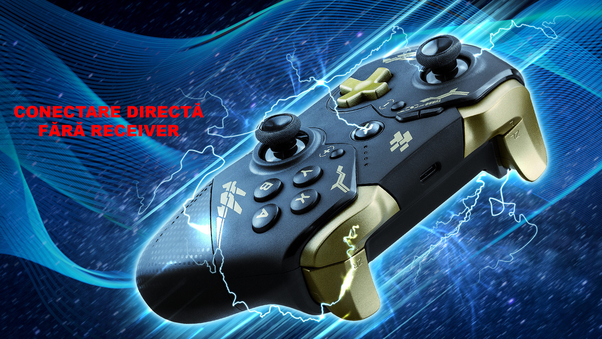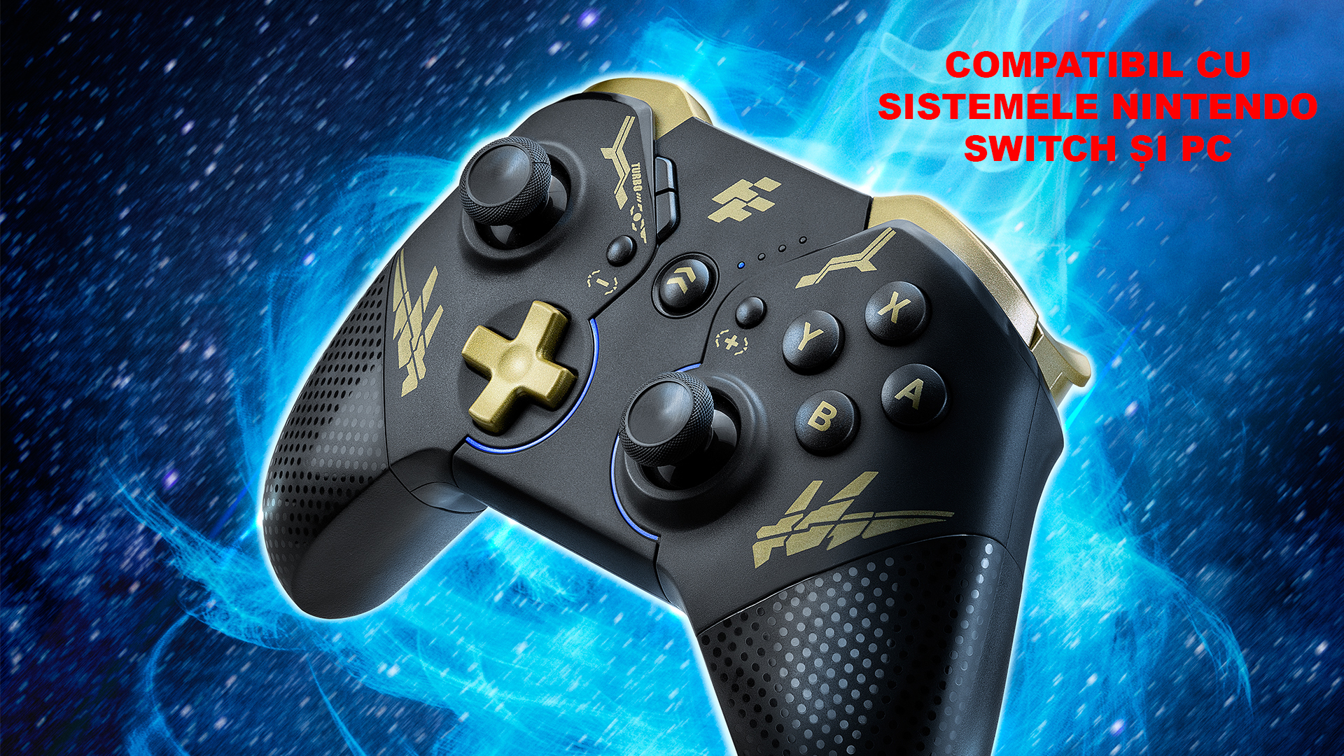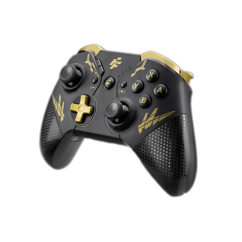 Gamepad FlashFire Swing Pad BTG negru cu auriu, conectivitate Bluetooth, One-Key Wake-Up, suporta MACRO, 2 motoare pentru vibratii, senzor de miscare incorporat, Auto Turbo, iluminare RGB, autonomie: aproximativ 10 ore, timp de incarcare: 2-3 ore, acumulator Litiu, conector USB Type-C, compatibilitate: Nintendo Switch / PC, dimensiuni: 180x160x70mm, greutate: 340g