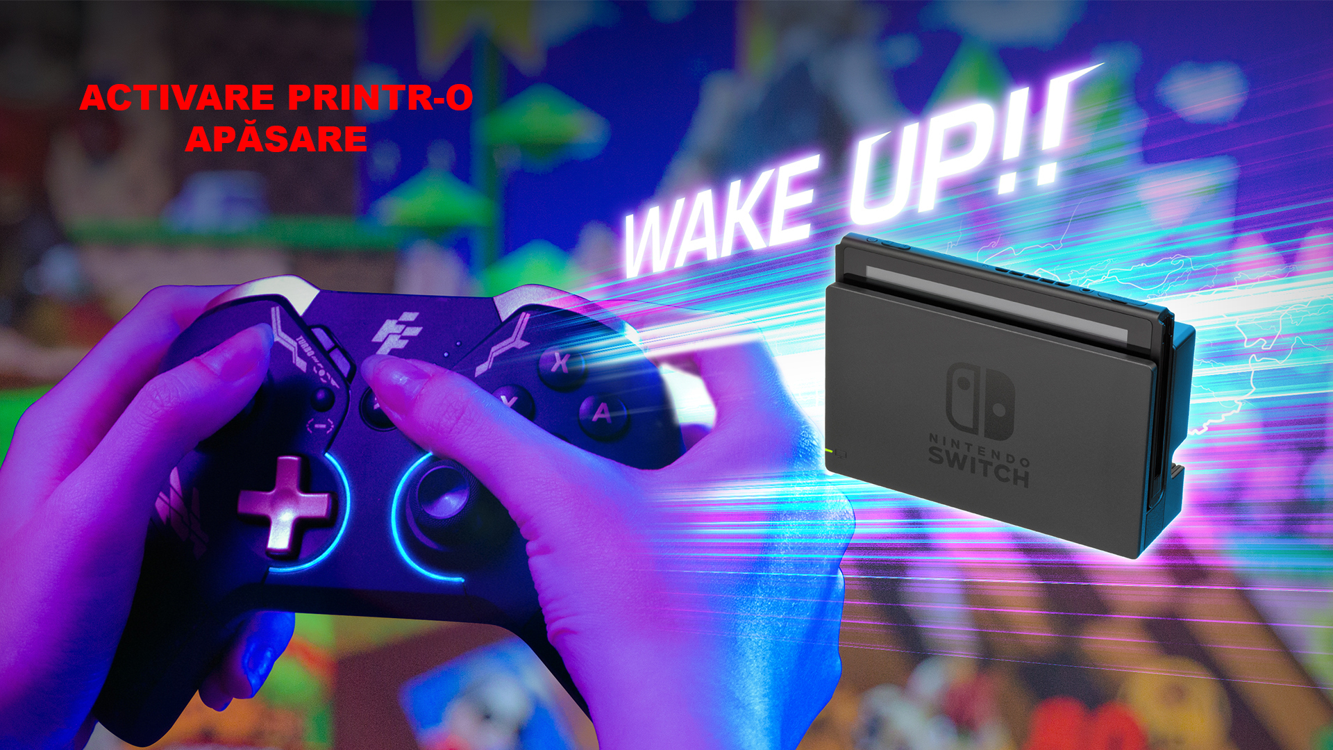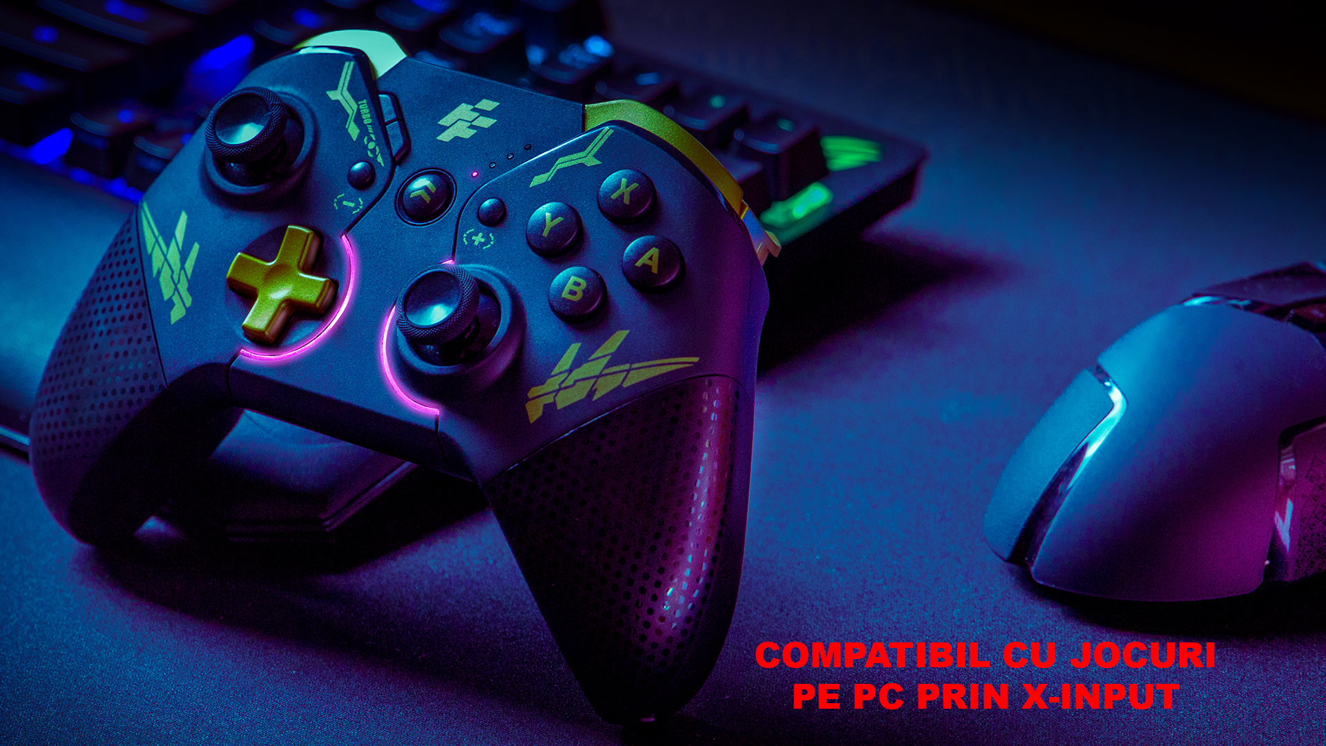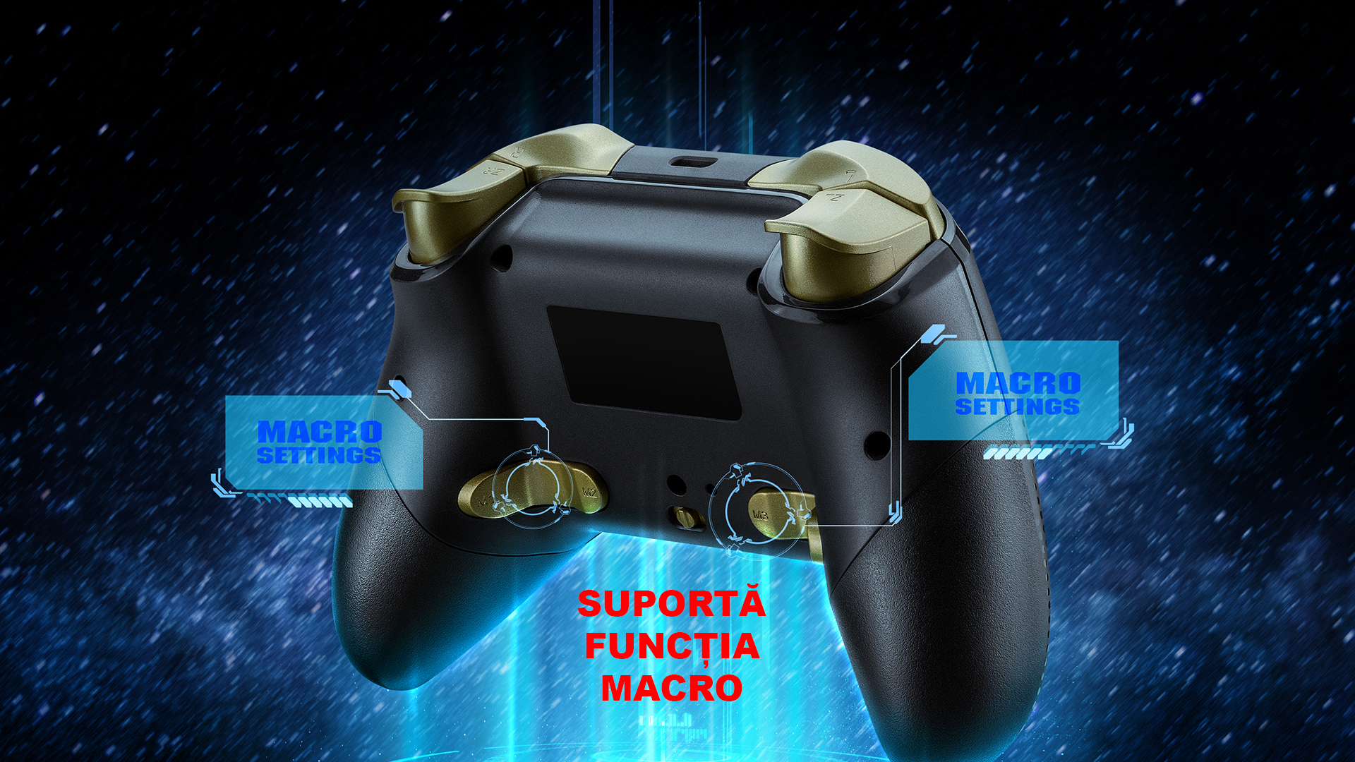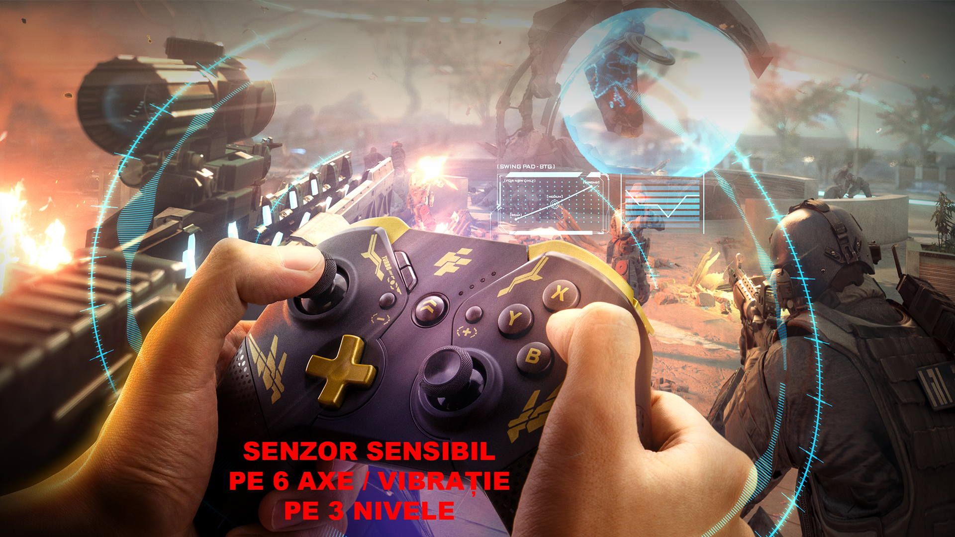 Gamepad FlashFire Swing Pad BTG negru cu auriu, conectivitate Bluetooth, One-Key Wake-Up, suporta MACRO, 2 motoare pentru vibratii, senzor de miscare incorporat, Auto Turbo, iluminare RGB, autonomie: aproximativ 10 ore, timp de incarcare: 2-3 ore, acumulator Litiu, conector USB Type-C, compatibilitate: Nintendo Switch / PC, dimensiuni: 180x160x70mm, greutate: 340g