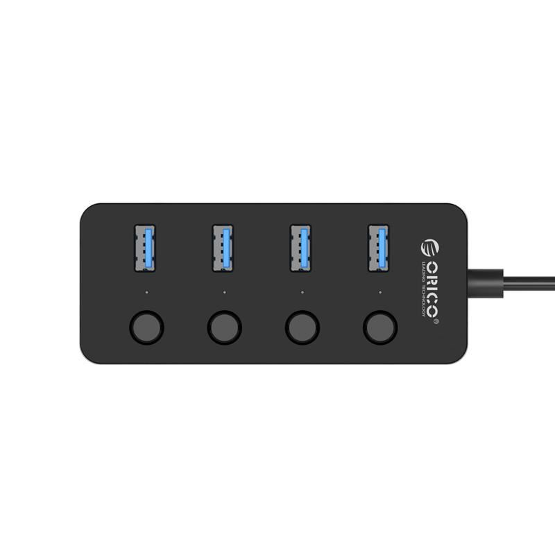 HUB USB Orico W9PH4-U3 V1 4 port-uri USB 3.0 negru, 4 port-uri USB 3.0 cu buton ON/OFF, LED status, plug and play, posibilitate hot swap, lungime cablu: 30cm, dimensiuni: 116 x 46 x 24mm