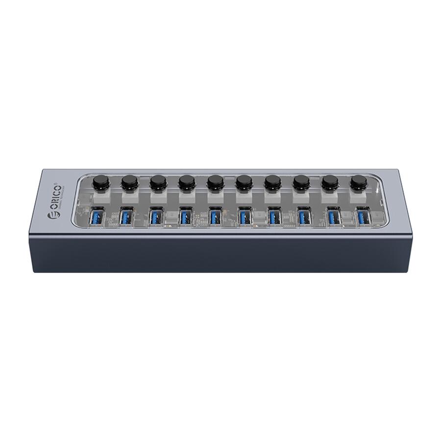 HUB USB Orico AT2U3-10AB USB 3.0 10 port-uri gri, 10 port-uri USB 3.0 cu buton ON/OFF, indicator luminos pentru fiecare port, constructie din aluminiu si PC, plug and play, posibilitate hot swap, rata de transfer de pana la 5Gbps, include alimentator 12V / 4A 48W, protocol BC1.2, gauri in carcasa pentru montare pe perete, lungime cablu: 1m, dimensiuni: 190 x 58 x 26mm