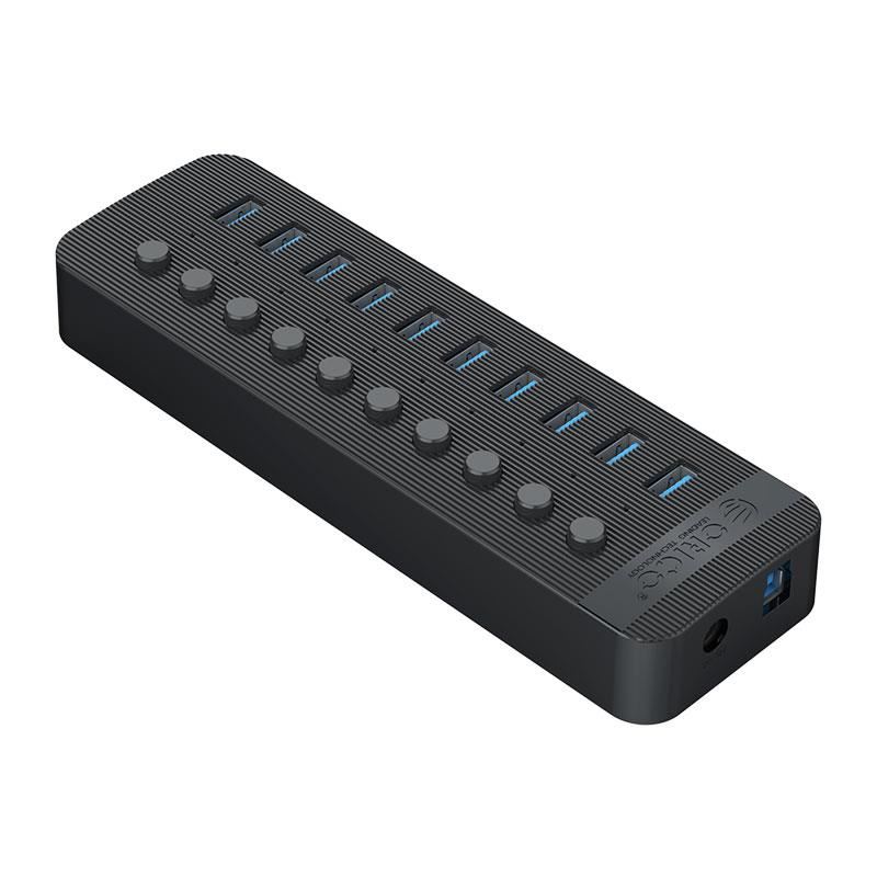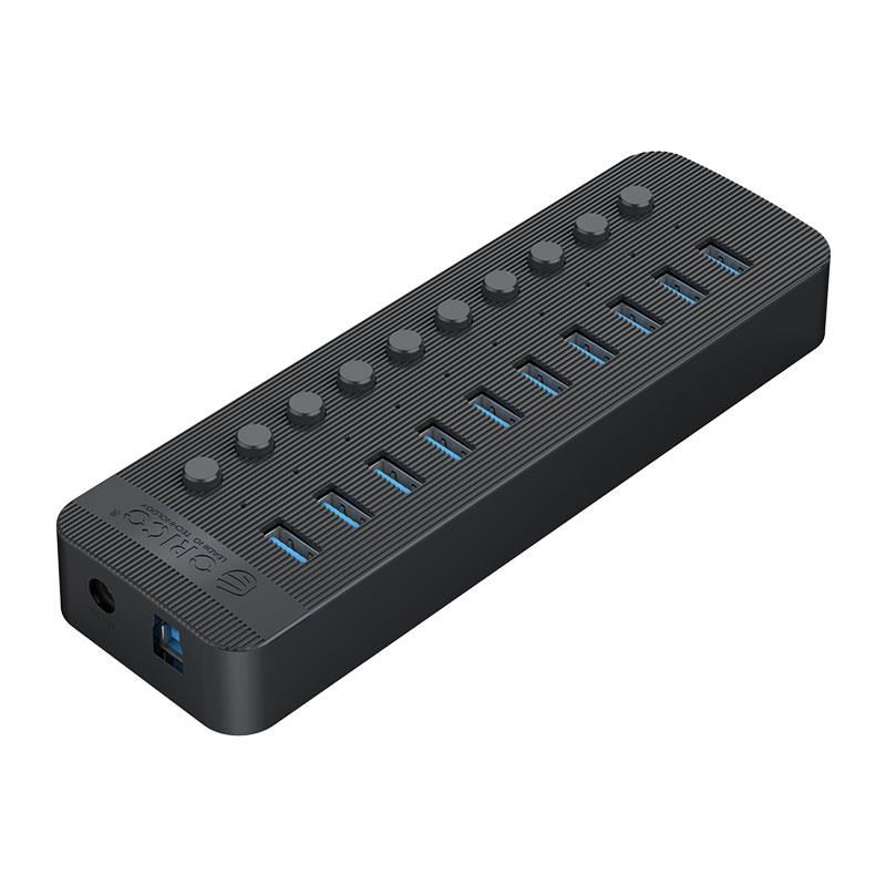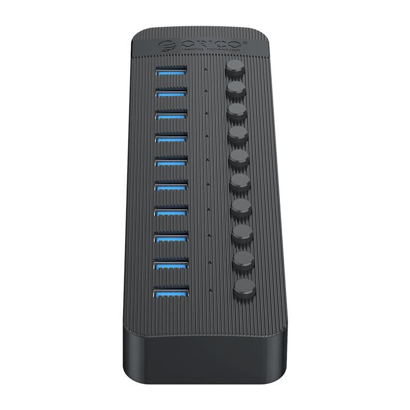 HUB USB Orico CT2U3-10AB USB 3.0 negru, 10 port-uri USB 3.0 cu buton ON/OFF, plug and play, posibilitate hot swap, include alimentator 12V / 4A 48W, lungime cablu: 1m, dimensiuni: 190 x 58 x 26mm