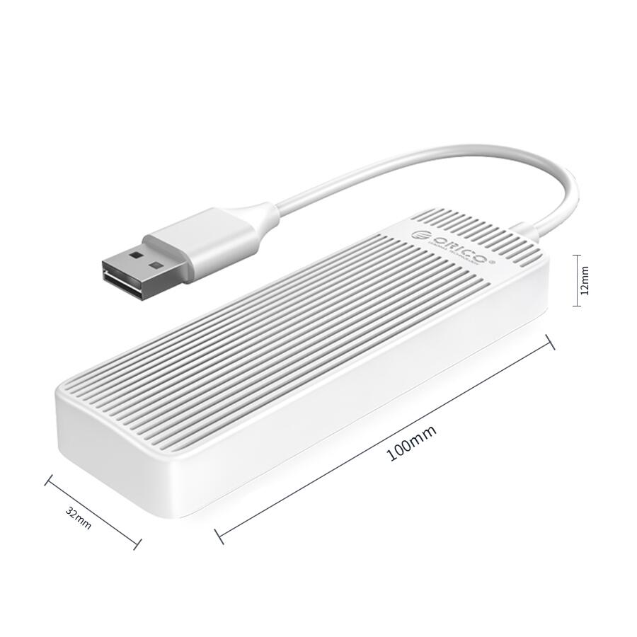 HUB USB Orico FL02 USB2.0 alb, 4 port-uri USB 2.0, plug and play, posibilitate hot swap, lungime cablu: 30cm, dimensiuni: 32x100x12mm, greutate: 60g