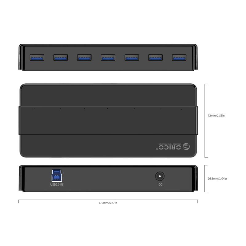 HUB USB Orico H7928-U3 USB 3.0 negru, 7 port-uri USB 3.0, Plug & Play, posibilitate hot swap, include cablu date USB 3.0 si adaptor de curent (12V2.5A), lungime cablu date: 1m, protectii: over voltage protection, over current protection, short circuit protection, leakage protection, compatibilitate: Windows/Mac OS/Linux, dimensiuni: 174x72x26.5mm