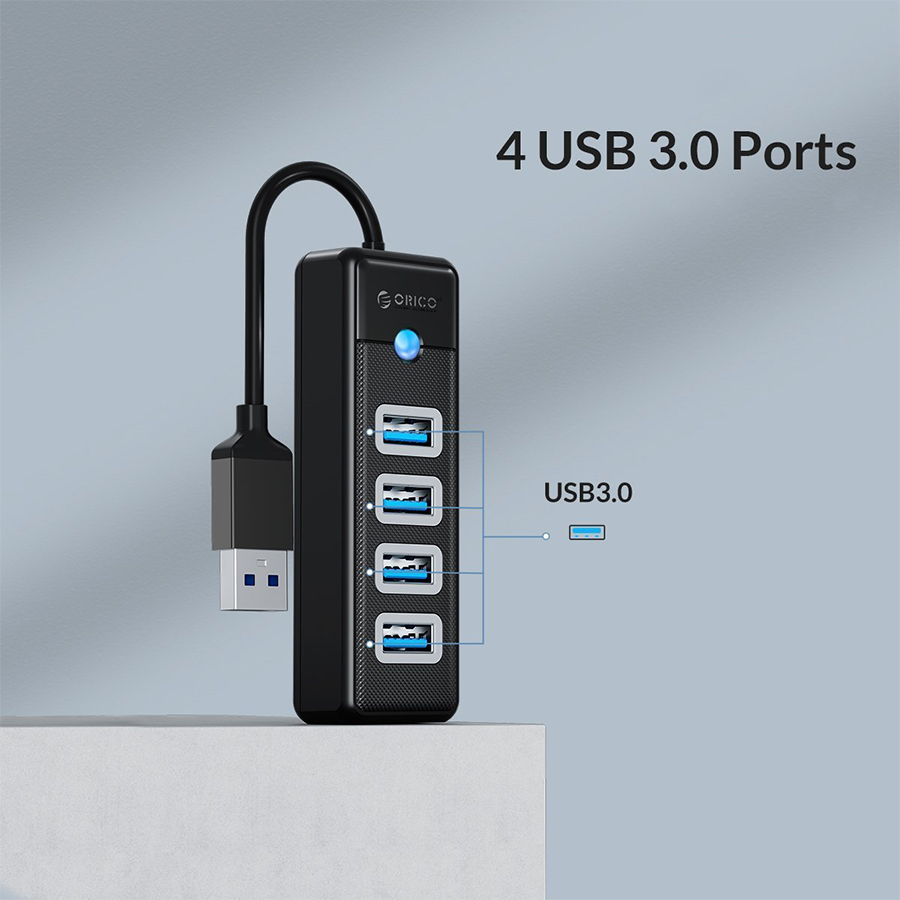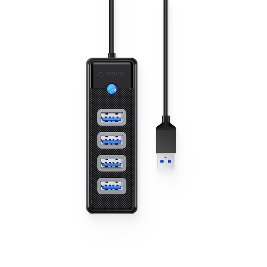 HUB USB Orico PW4U-U3 negru, conectori: 4x USB 3.0 Type-A, Plug & Play, posibilitate hot swap, protectii: over current / over-voltage / short circuit protection, viteza de transfer de pana la 5Gbps, conector intrare: USB 3.0 Type A, lungime cablu: 15cm, dimensiuni: 93x31x19.5mm