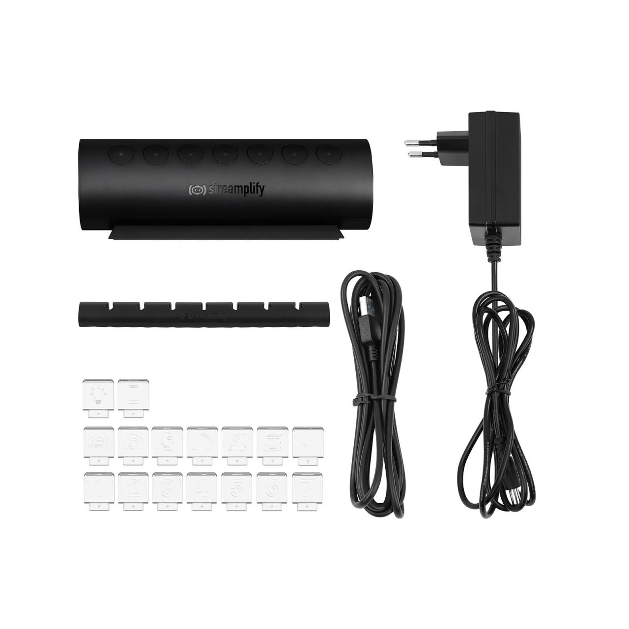 HUB USB Streamplify CTRL 7 iluminare RGB 7 port-uri, conectori: 6x USB 3.0 Type-A si 1x USB2.0 Fast Charge, Plug & Play, posibilitate hot swap, butonr ON/OFF pentru fiecare port, 16 logo-uri acrilice disponibile in pachet, iluminare RGB, protectii: over current / over-voltage / short circuit protection, conector input: 1x USB 3.0, alimentare: 12V/2A, include organizator cabluri, lungime cablu: 1.8m