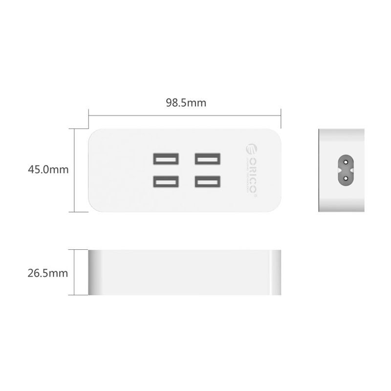 Orico DCV-4U 20W Smart USB Desktop Charger White, incarcator cu 4 port-uri USB pentru diverse dispozitive (tablete, telefoane mobile, etc.), eficienta conversiei de 85% genereaza mai putina caldura, foloseste circuit inteligent de detectare a curentului corespunzator aparatului conectat (Intelligent Identification IC), constructie din plastic PC+ABS ignifug, intrare: 100-240V 50/60Hz 0.8A Max, iesiri: 5V2.4A x 4, putere maxima: 5V4A 20W, protectii: over voltage/over current/over charge/over heat/electric leak/short circuit protection, dimensiuni: 102 x 45 x 26mm