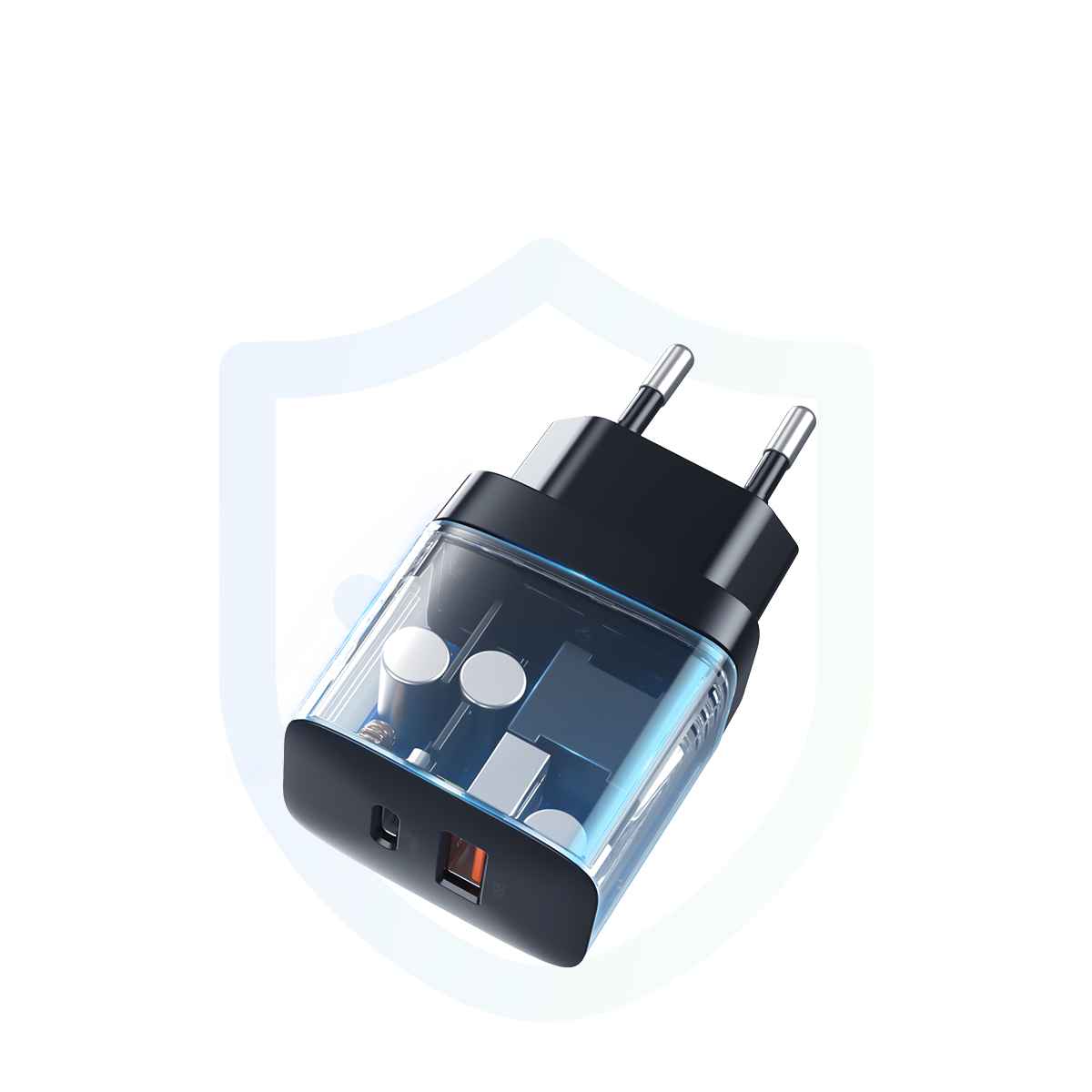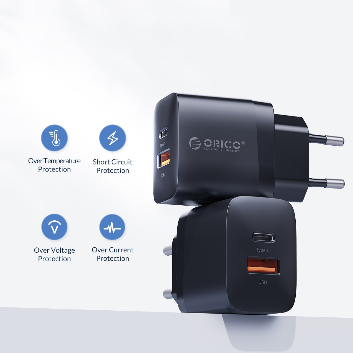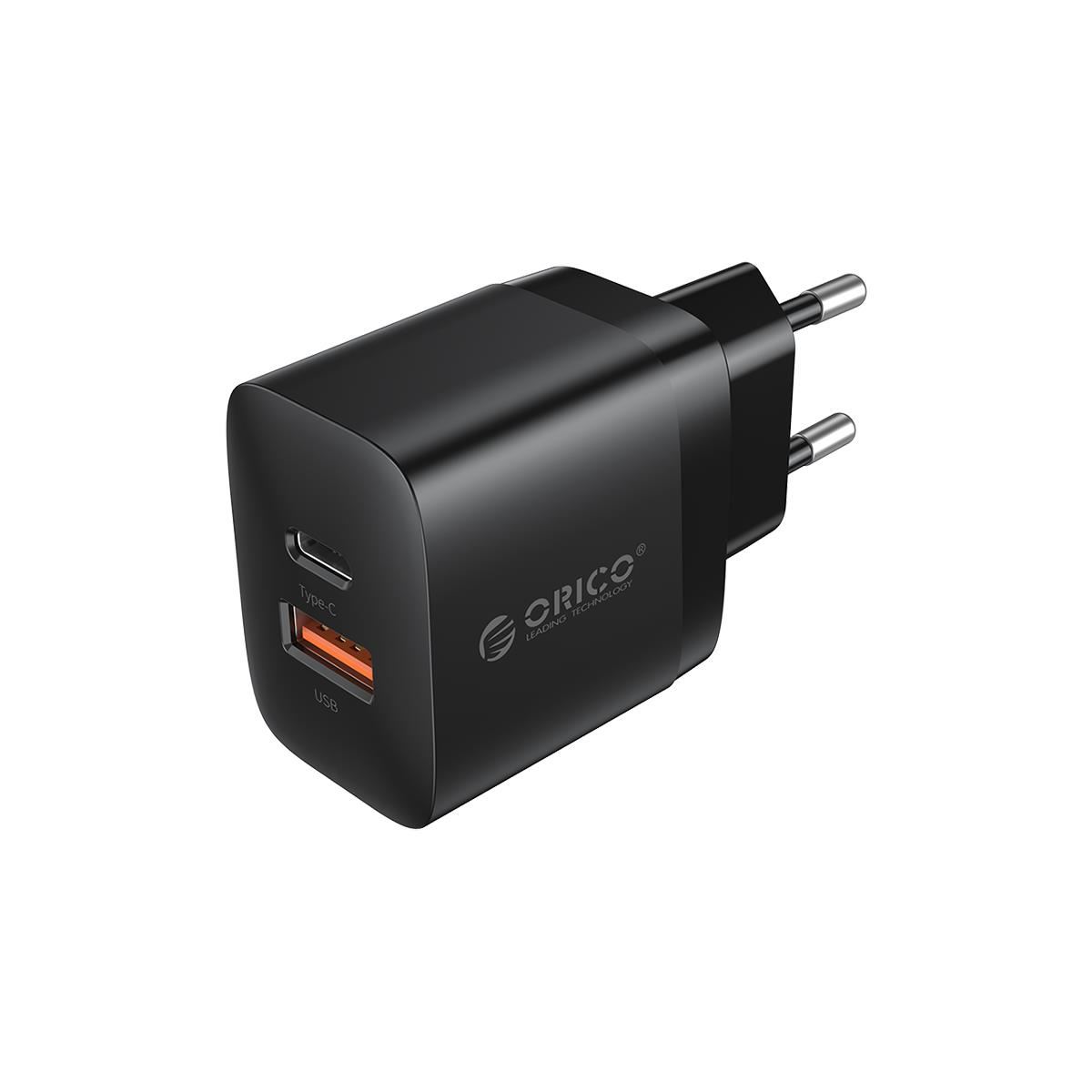 Incarcator Orico PV20-1U1C negru, incarcator cu 2 port-uri, 1x USB Type A / 1x USB Type-C pentru diverse dispozitive (tablete, telefoane mobile, etc.), foloseste circuit inteligent de detectare a curentului corespunzator aparatului conectat, protocoale suportate: BC1.2 / Apple2.4A / QC2.0 Class A / QC3.0 Class A / PD2.0 / PD3.0 / FCP / AFC, putere maxima: USB-A: 5V/3A / 9V/2A / 12V/1.5A, USB-C: 5V/3A, 9V/2.22A, 12V/1.5A / 20W, protectii: short-circuit protection, over-charging protection, overvoltage protection, overheat protection, over-current protection, overload protection, surge protection