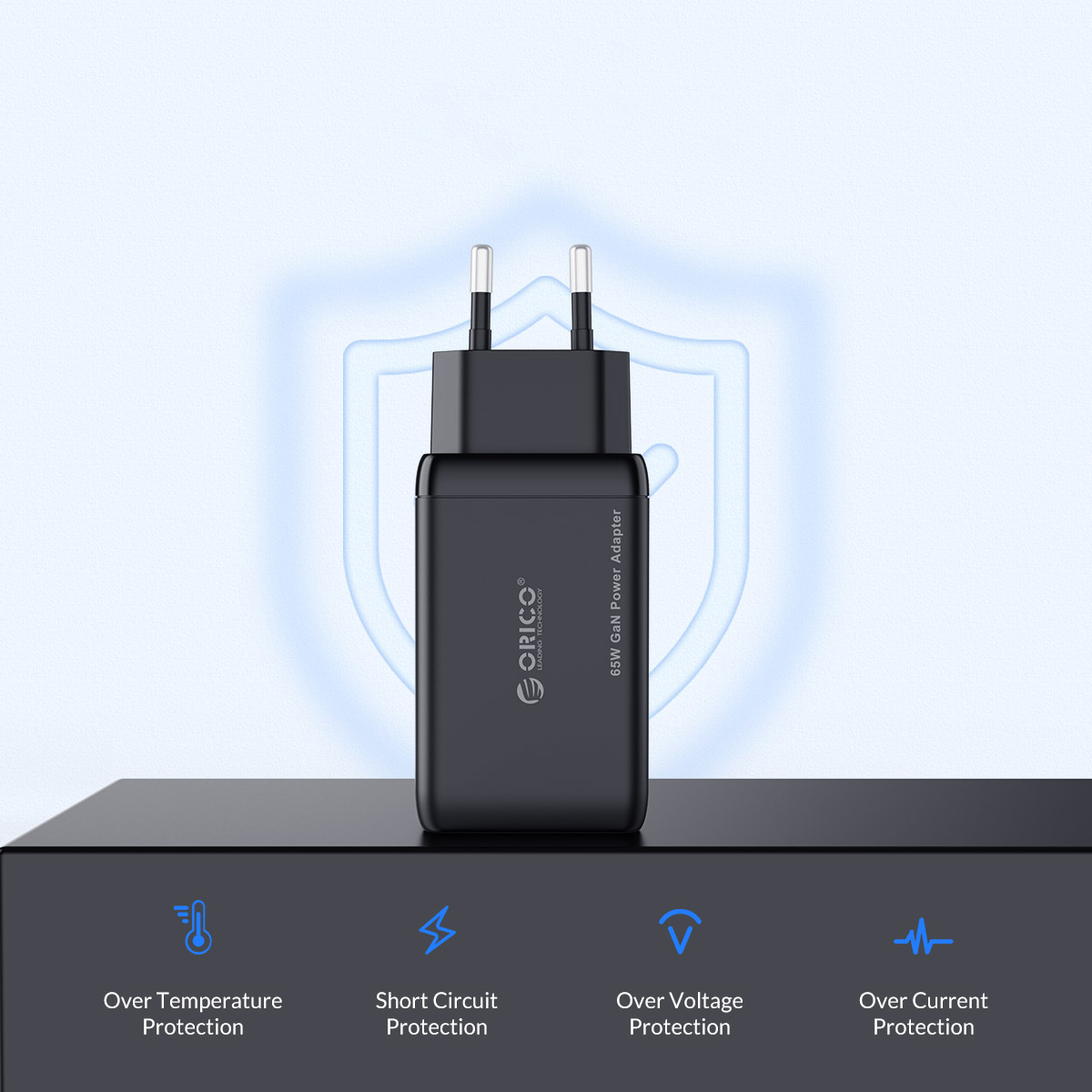 Incarcator Orico PV65-1U2C negru, incarcator cu 3 port-uri, 1x USB Type A / 2x USB Type-C pentru diverse dispozitive (tablete, telefoane mobile, etc.), foloseste circuit inteligent de detectare a curentului corespunzator aparatului conectat, protocoale suportate: USB-A : BC1.2 / Apple2.4A / QC2.0 ClassA / QC3.0 ClassA / Samsung 2.0A / FCP / SCP / AFC / PE1.0 / PE2.0, USB-C : BC1.2 / Apple2.4A / QC2.0 ClassA / QC3.0 ClassA / QC4.0ClassA / PD2.0 / PD3.0 / PPS / FCP / SCP / AFC / PE1.0 / PE2.0, putere maxima: USB A: 4.5V/5A / 5V/4.5A / 9V/3A / 12V/2.5A / 20V/1.5A / 30W, USB-C: 5V/9V/12V/15V-3A / 20V/3.25A / 65W, protectii: short-circuit protection, over-charging protection, overvoltage protection, overheat protection, over-current protection, overload protection, surge protection, dimensiuni: 65x40x28mm