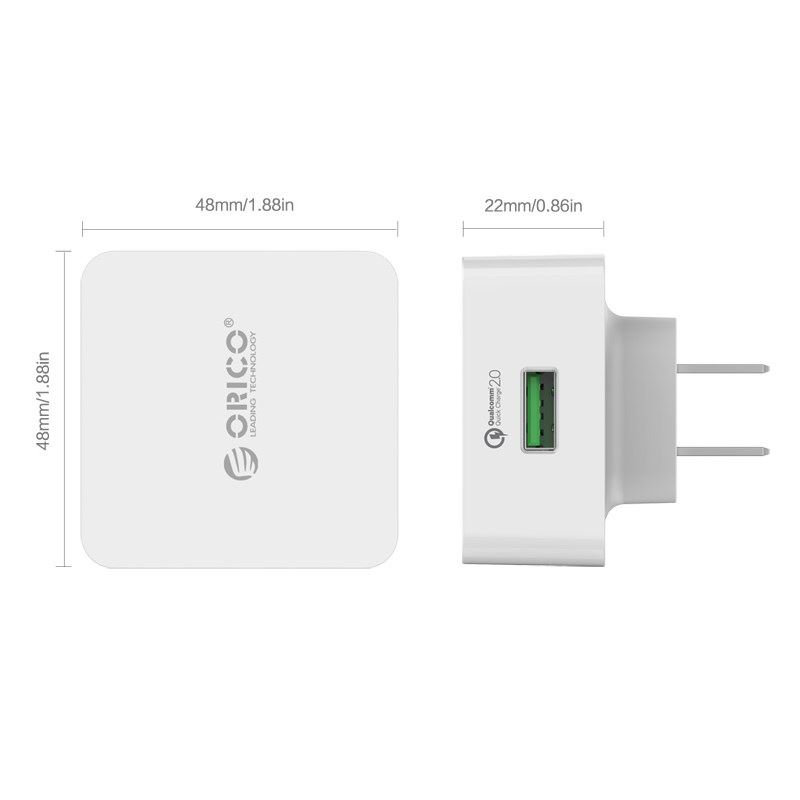 Orico QCK-1U 18W QC2.0 USB Wall Charger White, incarcator USB pentru diverse dispozitive (tablete, telefoane mobile, etc.), tehnologie Qualcomm QC2.0, viteza de incarcare cu 75% mai rapida, eficienta conversiei de 85% genereaza mai putina caldura, foloseste circuit inteligent de detectare a curentului corespunzator aparatului conectat (Intelligent Identification IC), intrare: 100-240V 50/60Hz 0.5A Max, iesiri: 5V/2A 9V/2A 12V/1.5A x 1, putere maxima: 18W, include cablu de date microUSB adaptat specificatiilor curentului furnizat de incarcator, protectii: over voltage/over current/over charge/over heat/electric leak/short circuit protection, dimensiuni: 48 x 48 x 22mm