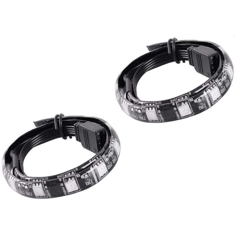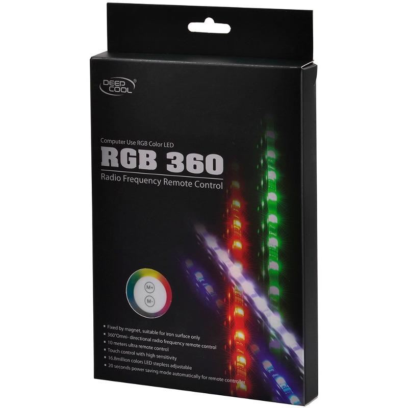Deepcool RGB 360 LED Lighting Kit, fixare magnetica, lungime (cu cablu 200mm): 500mm, dimensiuni benzi LED: 300x10x3mm, numar LED-uri: 18buc/banda, include 2 benzi LED ce pot fi taiate la lungimea dorita, cabluri incluse: 1x alimentare, 1x extensie, include telecomanda fara fir pentru controlul culorii LED-urilor si a efectelor de iluminare, compatibil cu Asus AURA, greutate: 165g