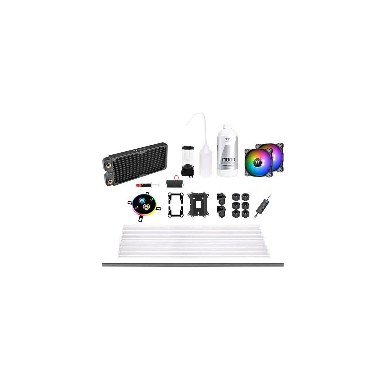 Kit cooler procesor cu lichid Thermaltake Pacific C240 DDC Hard Tube iluminare aRGB, kit sistem racire cu apa pentru procesor compus din: 2 ventilatoare Pure 12 aRGB 120mm (500 ~ 1500 RPM, 56.45 CFM, 25.8 dB-A, 1.59mm-H2O, Hydraulic Bearing) si controller aRGB, pompa Pacific PR15-DDC (dimensiuni LxWxH: 81x66.4x179mm, conector: 3 pin, material: POM+PMMA, capacitate: 200ml, tip filet: G1/4), bloc procesor Pacific W4 ARGB (dimensiuni LxWxH: 93.4x93.4x22mm, conector: 4 pin Molex, material: cupru+PMMA, compatibilitate: Intel: LGA 2066/2011/1366/1156/1155/1151/1150/775, AMD: AM4/FM2/FM1AM3+/AM3/AM2+/AM2, greutate: 670g, tip filet: G 1/4), radiator Pacific C240 (dimensiuni LxWxH: 279x119x29.5mm, material: cupru, FPI( Fin Per Inch): 17, greutate: 562g, tip filet: 2x G 1/4), set fitting-uri Pacific C-PRO G1/4 PETG (diametru: 16mm, tip filet: G 1/4, material: cupru, greutate: 40g, contine 6 fitting-uri), set fitting-uri Pacific G1/4 90 Degree Adapter (diametru: 16mm, tip filet: G 1/4, material: cupru, greutate: 100g, cot 90° contine 2 fitting-uri), 2 seturi de 4 tuburi V-Tubler PETG Tube 16mm (material: PETG, culoare: transparenta), lichid racire Thermaltake T1000 Coolant Pure Clear