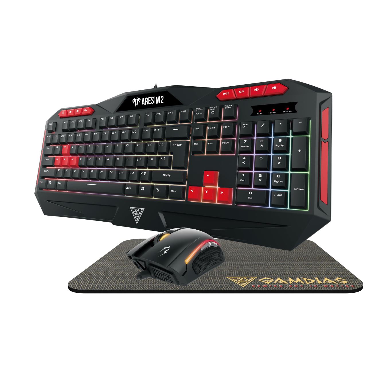 Kit gaming Gamdias Ares M2 3 in 1 negru iluminare RGB, specificatii tastatura: iluminare LED RGB pe 6 zone si 4 nivele de intensitate luminoasa, taste anti-ghosting, 26 de taste fara conflict (26-key rollover), 8 taste multimedia, polling rate: 1000Hz, mod schimbare WASD/Taste directionale, personalizare si configurare cu ajutorul programului GAMDIAS HERA, memorie on-board: 72KB, lungime cablu imbracat in textil: 1.8m, dimensiuni: 470x220x45mm, greutate: 710g, specificatii mouse: mouse optic cu fir, iluminare LED RGB, 3200 DPI (1200/1600/2000/3200 DPI), durata de viata micro switch-uri: 3 milioane de click-uri, numar butoane: 6, , benzi laterale din cauciuc pentru o priza mai buna, design ambidextru, lungime cablu: 1.5m, dimensiuni: 118x67x38.5mm, greutate: 105g, specificatii mousepad: dimensiuni: 240x180x3mm