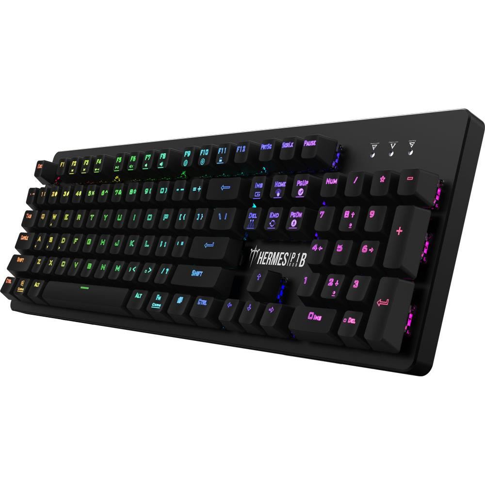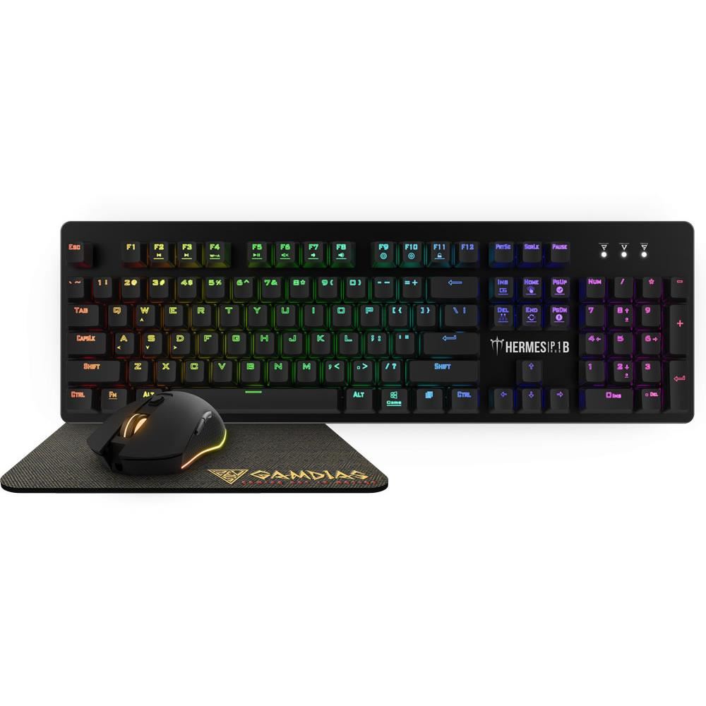 Kit gaming Gamdias Hermes P1B iluminare RGB negru, specificatii tastatura Hermes P1B RGB: iluminare LED RGB, switch-uri optice Gamdias Blue, polling rate: 1000Hz, toate tastele anti-ghosting, toate tastele fara conflict (n-key rollover), 10 taste multimedia, rotita de volum, lungime cablu: 1.5m, dimensiuni: 440x140x45mm, specificatii mouse Zeus E3: design ergonomic, ilumiare LED RGB, numar butoare: 7, 1200/1600/ 2400/ 3600 DPI (Default 1200), lungime cablu: 1.5m, dimensiuni: 127x65x38mm, greutate: 107g, specificatii mousepad: material suprafata: reinforced textile, material baza: cauciuc, design special pentru aderenta, marime M, dimensiuni: 240x180x1.5mm