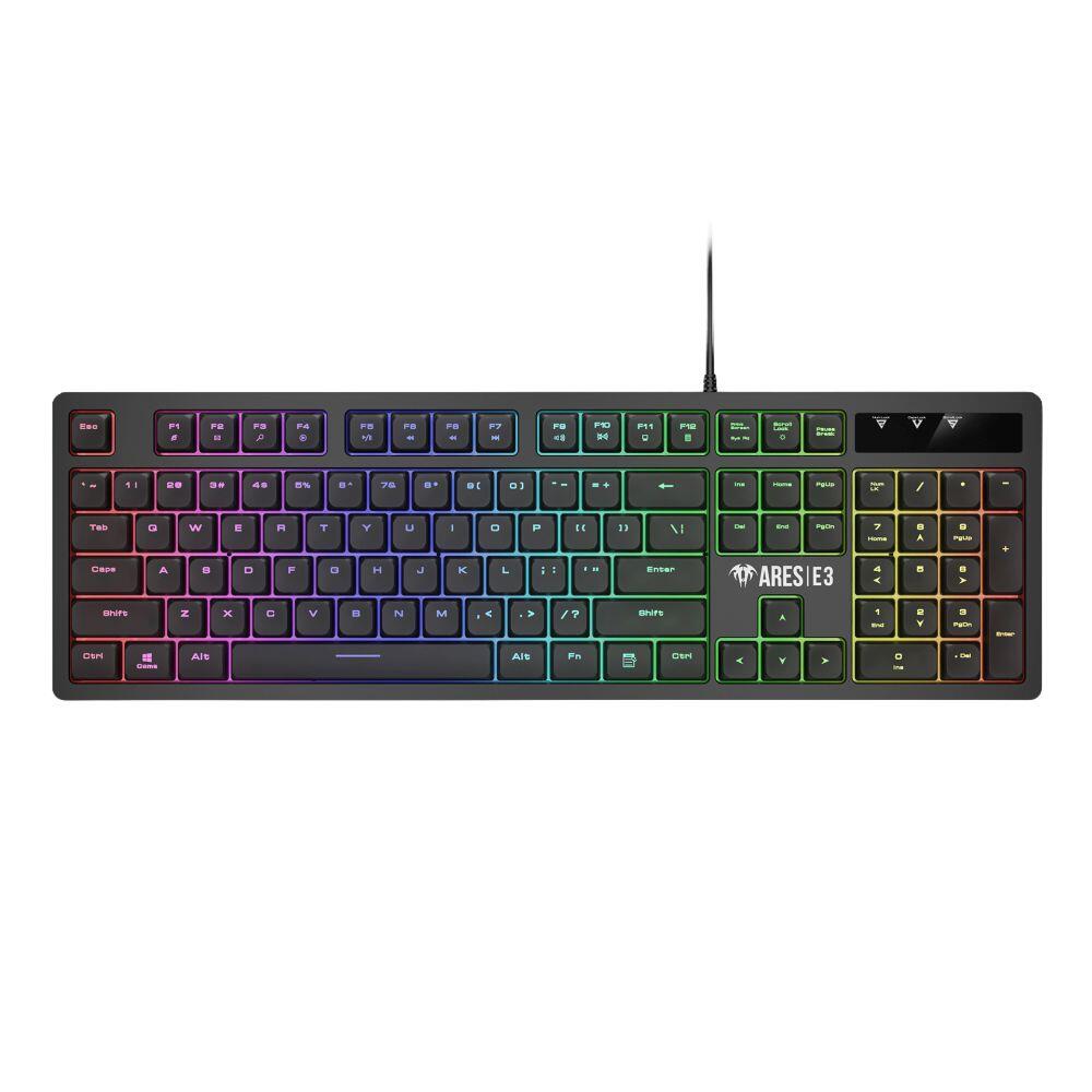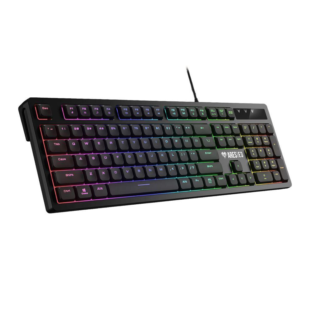 Kit gaming Gamdias Poseidon E2 3 in 1 negru iluminare RGB, specificatii tastatura ARES E3 Rainbow: iluminare LED Rainbow 4 nivele de intensitate luminoasa, taste anti-ghosting, 6 de taste fara conflict (6-key rollover), 8 taste multimedia, lungime cablu: 1.8m, dimensiuni: 446x151x28.5mm, greutate: 545g, specificatii mouse: 1200/1800/ 2400/ 3600 DPI (Default 1200), senzor optic, iluminare multicolora, conector: USB, lungime cablu: 1.5m, dimensiuni: 124x61x39mm, greutate: 93g, specificatii casti: design ergonomic, iluminare LED multicolora, design ergonomic, microfon omnidirectional flexibil (dimensiuni: Φ4x1.5mm, sensibilitate: -38dB±3dB), difuzoare: 50mm (impedanta: 21Ω, sensibilitate: 115±3dB), conectori: USB / 2x jack 3.5mm TRS, adaptor 2xjack 3.5mm TRS, lungime cablu: 1.8m, greutate: 283g