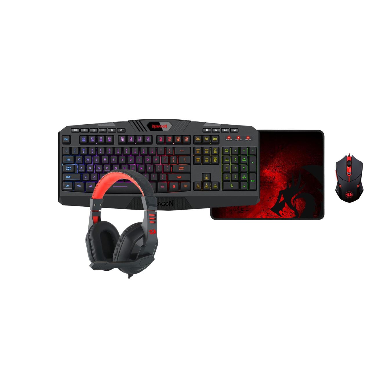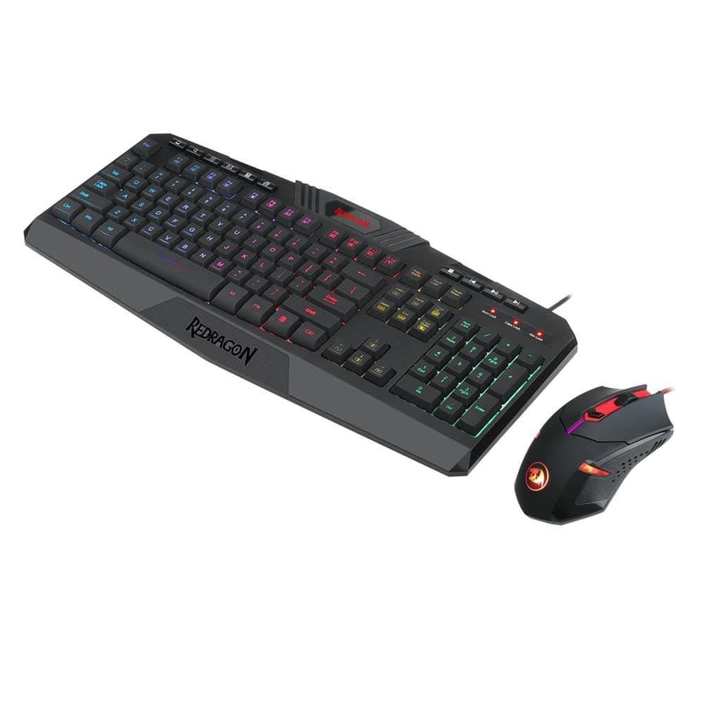 Redragon S101-BA 4 in 1 Kit, 25 taste fara conflict (25-key rollover), 12 taste multimedia, 2 viteze de input a tastelor, iluminare RGB cu diferite efecte si viteze, tasta WIN poate fi dezactivata in timpul jocurilor, lungime cablu tastatura: 1.5m, mouse Centrophorus: rezolutie mouse: 3200 DPI, acceleratie 30G, numar butoane mouse: 6, iluminare LED a mouse-ului, picioruse de teflon, conector mouse USB placat cu aur, lungime cablu mouse: 1.8m, dimensiuni mouse: 124x71x39mm, greutate mouse: 140g (incluzand greutati 2.4g x 8 bucati), USB, casti audio Garuda: include microfon (sensibilitate: -45dB±5dB, impedanta: 2.2KΩ), difuzoare: 40mm (frecventa raspuns: 20Hz-20KHz, sensibilitate (S.P.L): 103dB), design ergonomic, conectori: 2x jack 3.5mm TRS, lungime cablu casca: 2m, mousepad Archelon M: material suprafata: silk processed cloth, material baza: processed foam rubber, mouse pad rezistent la apa si usor de curatat, dimensiuni: 330 x 260 x 5mm