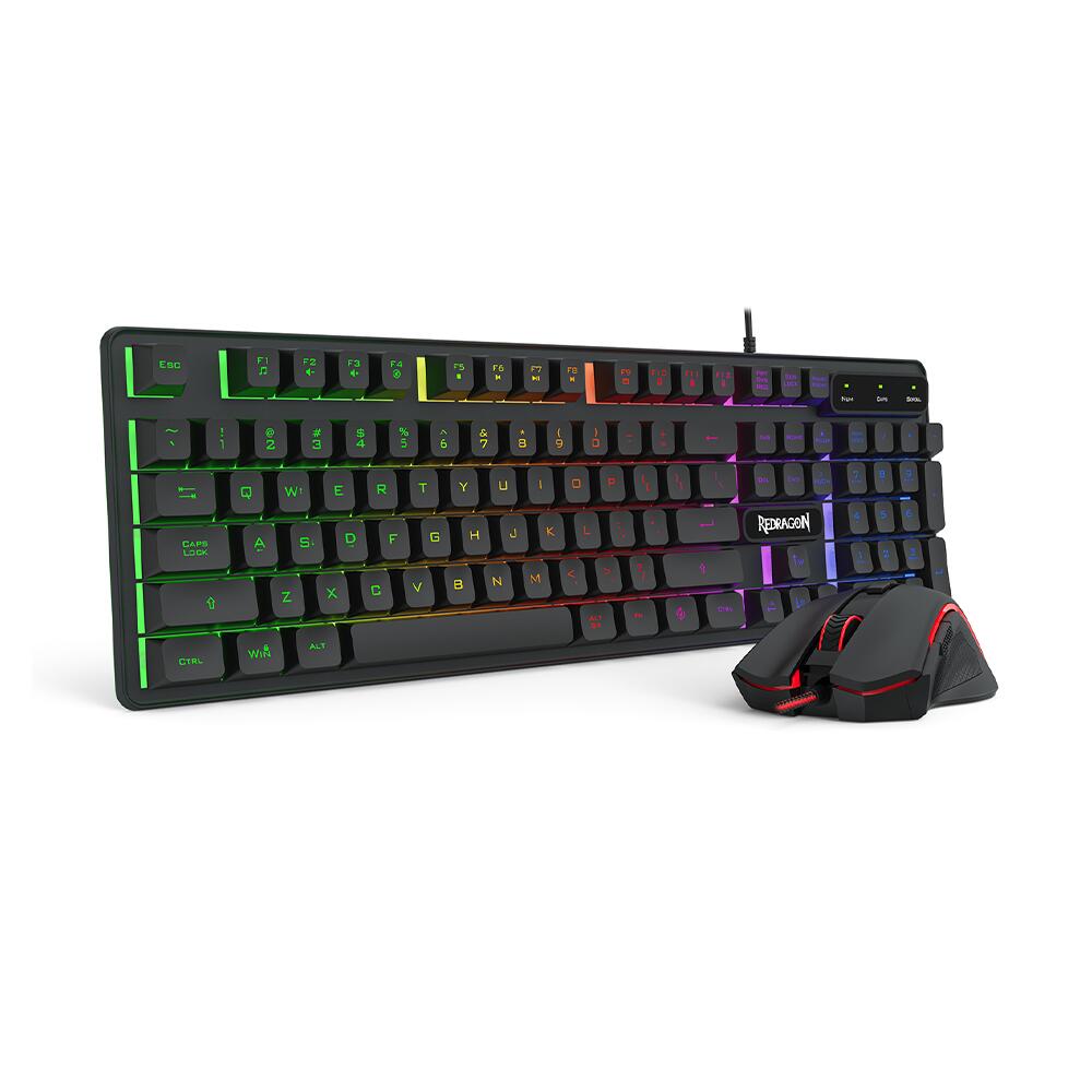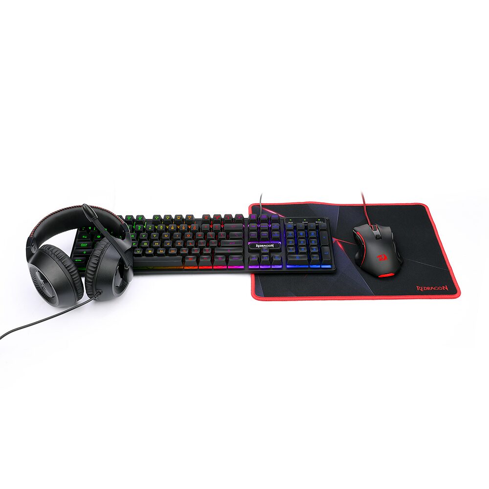 Kit gaming Redragon S137 Gaming Essentials 4 in 1 negru iluminare RGB, 25 taste fara conflict (25-key rollover), 20 taste multimedia, 5 moduri de iluminare RGB, tasta WIN poate fi dezactivata in timpul jocurilor, lungime cablu tastatura: 1.5m, rezolutie mouse: 3200 DPI, acceleratie 10G, polling rate: 500Hz, senzor optic: Pixart 3168, numar butoane mouse: 6, picioruse de teflon, conector mouse USB, lungime cablu mouse: 1.8m, dimensiuni mouse: 127x74x39mm, casti audio: includ microfon (sensibilitate: -38dB±5dB, impedanta: 2.2KΩ), difuzoare: 40mm (frecventa raspuns: 20Hz-20KHz, sensibilitate (S.P.L): 114dB), design ergonomic, conectori: 2x jack 3.5mm TRS (inclus si adaptor de la 2x jack TRS mama la 1x jack TRRS tata), lungime cablu casca: 1.5m, mousepad: material suprafata: silk processed cloth, material baza: processed foam rubber, mouse pad rezistent la apa si usor de curatat, dimensiuni: 330 x 260 x 3mm