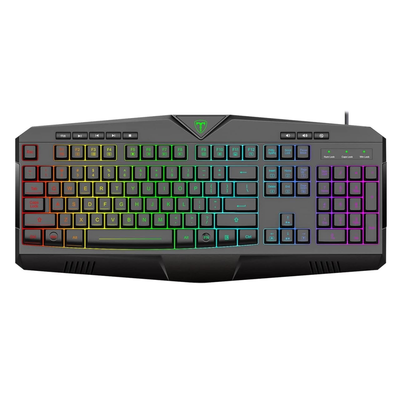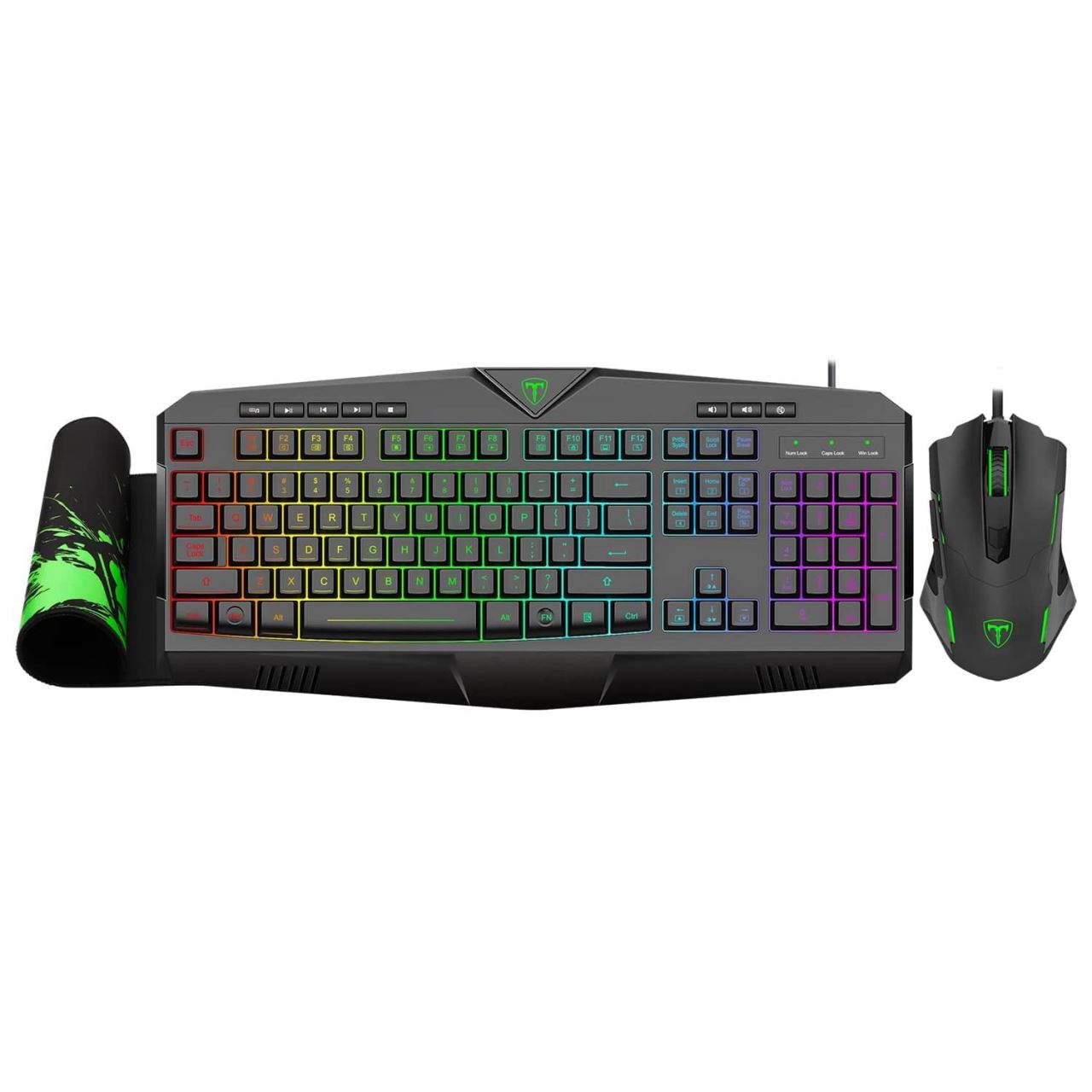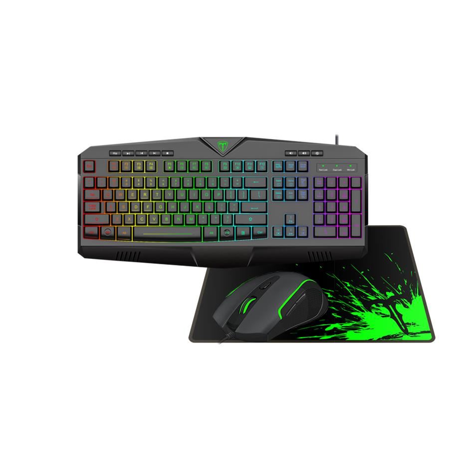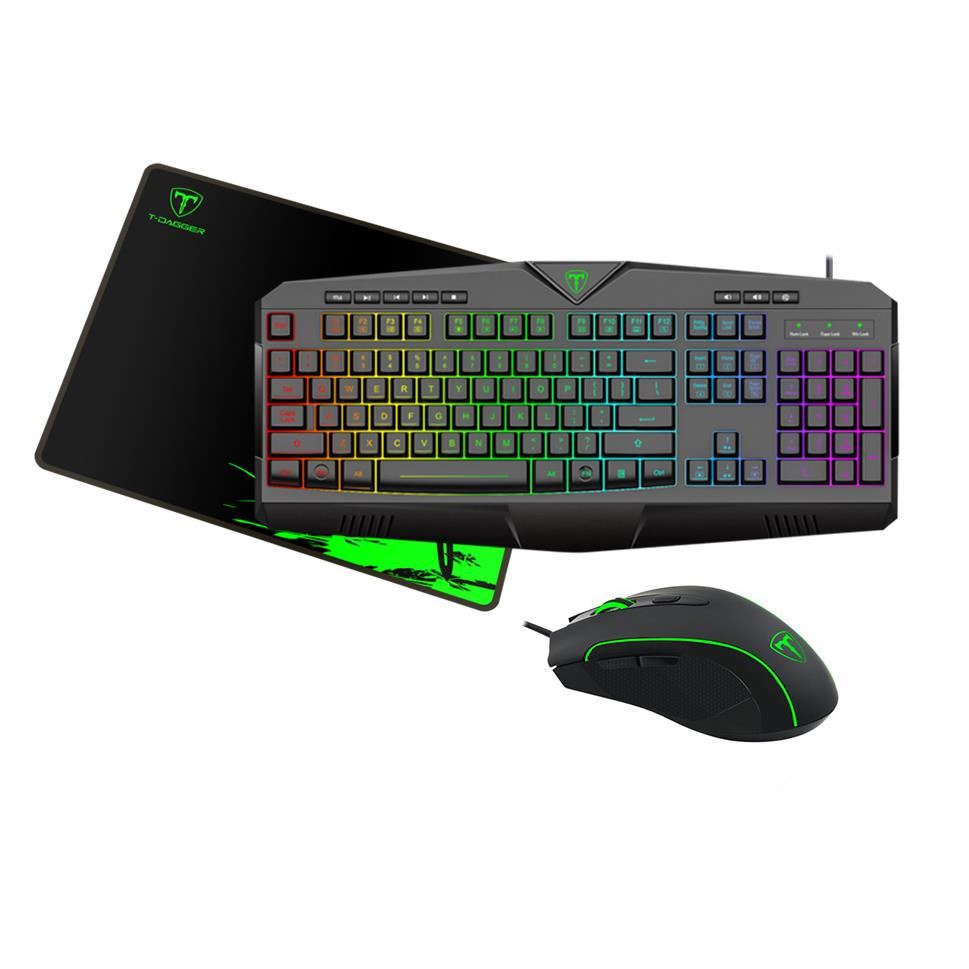 Kit gaming T-Dagger 3 in 1, 19 taste fara conflict (19-key rollover), 8 taste multimedia, iluminare RGB cu diferite efecte si viteze, tasta WIN poate fi dezactivata in timpul jocurilor, lungime cablu tastatura: 1.5m, mouse: rezolutie mouse: 1000/1600/2400 DPI, acceleratie 10G, polling rate: 500Hz, numar butoane mouse: 6, iluminare LED in 4 culori a mouse-ului, picioruse de teflon, conector mouse USB, mousepad Lava M: material suprafata: silk processed cloth, material baza: processed foam rubber, mouse pad rezistent la apa si usor de curatat, dimensiuni: 360 x 300 x 3mm