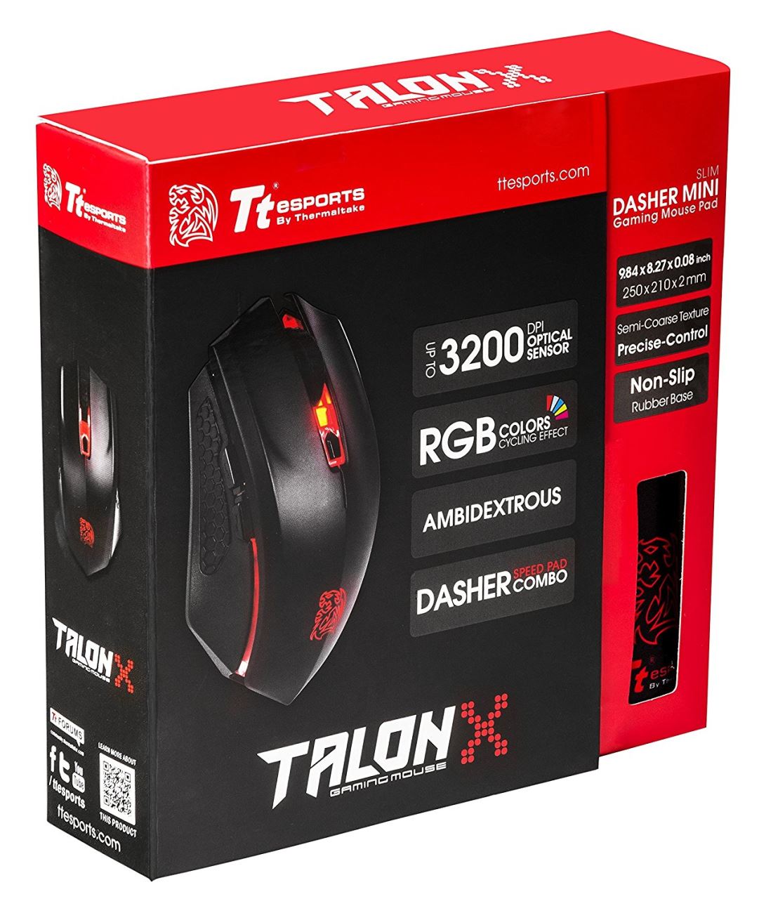 Tt eSPORTS TALON X Gaming Gear Combo, 3200/1600/800/400 DPI, senzor Pixart Avago 3050, switch-uri Omron (durata de viata: 10 milioane click-uri), numar butoane: 6, iluminare LED RGB cu diverse efecte de iluminare, lungime cablu: 1.8m, dimensiuni mouse: 122.93 x 71.25 x 42.45mm, greutate mouse: 140g, dimensiuni mousepad: 250 x 210 x 2mm, material suprafata: cloth weave, material baza: non-slip polyurethane