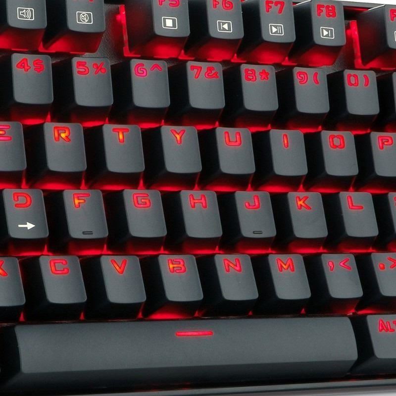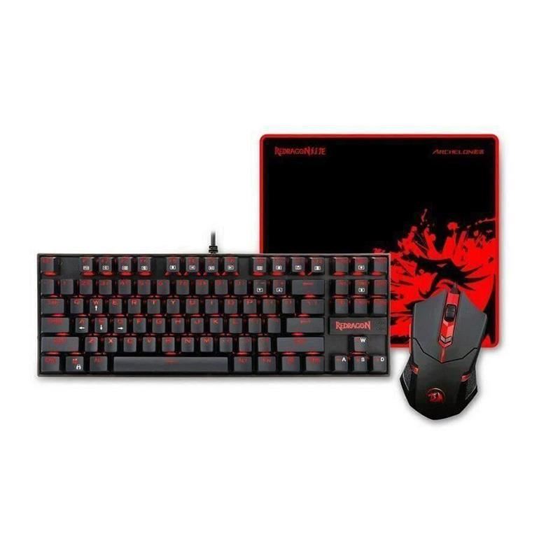 Kit-ul Redragon Gaming Essentials 3-in-1 V2 contine tastatura mecanica Kumara. Tastatura este mecanica cu switch-uri Outemu albastre, full anti-ghosting si toate tastele N-Key rollover, layout-ul este compact TKL (Ten KeyLess, 87 de taste), iar toate tastele sunt iluminate individual LED in culoarea rosie.