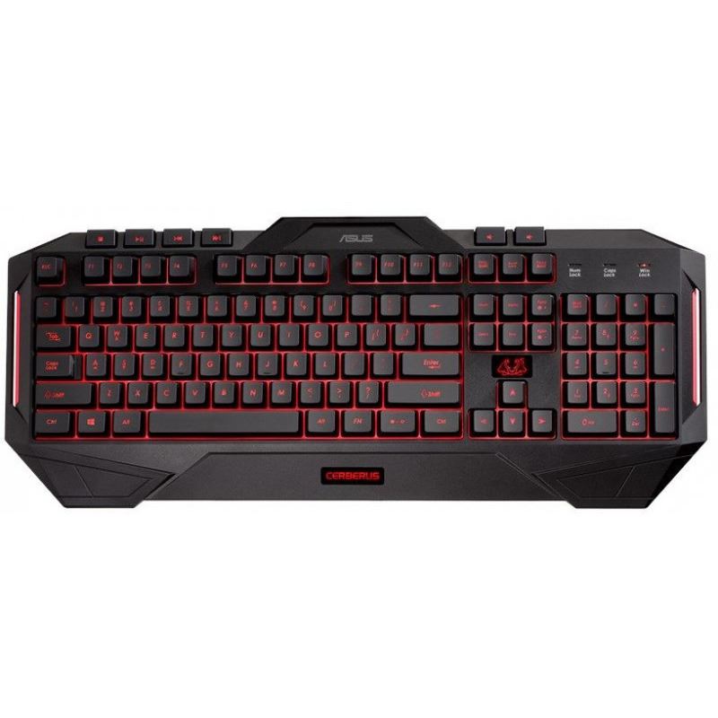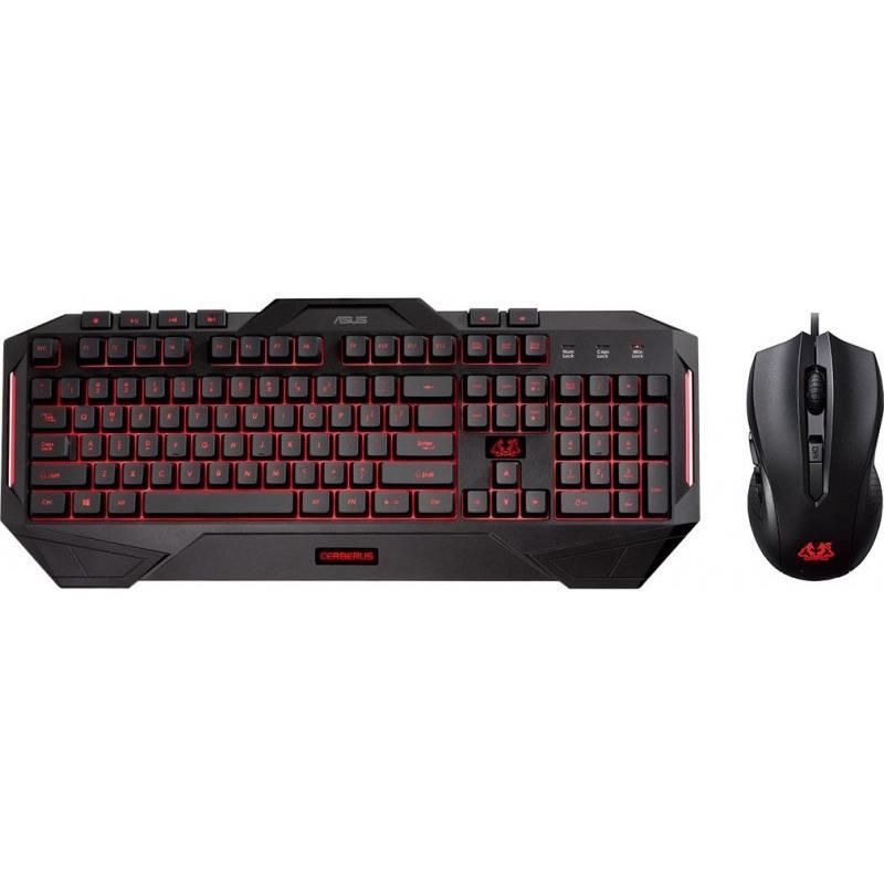 Kit tastatura si mouse Asus Cerberus, tastatrura: 19 taste fara conflict (19-key rollover), iluminare LED rosie sau albastra a tastelor (reglarea intensitatii si efect breathing), taste multimedia, tasta windows poate fi blocata, conector USB, lungime cablu: 200mm, USB, mouse: iluminare LED RGB cu effect breathing, 2500 DPI, numar butoane: 6 (6 programabile), picioruse de teflon, conector USB, lungime cablu: 1.8m