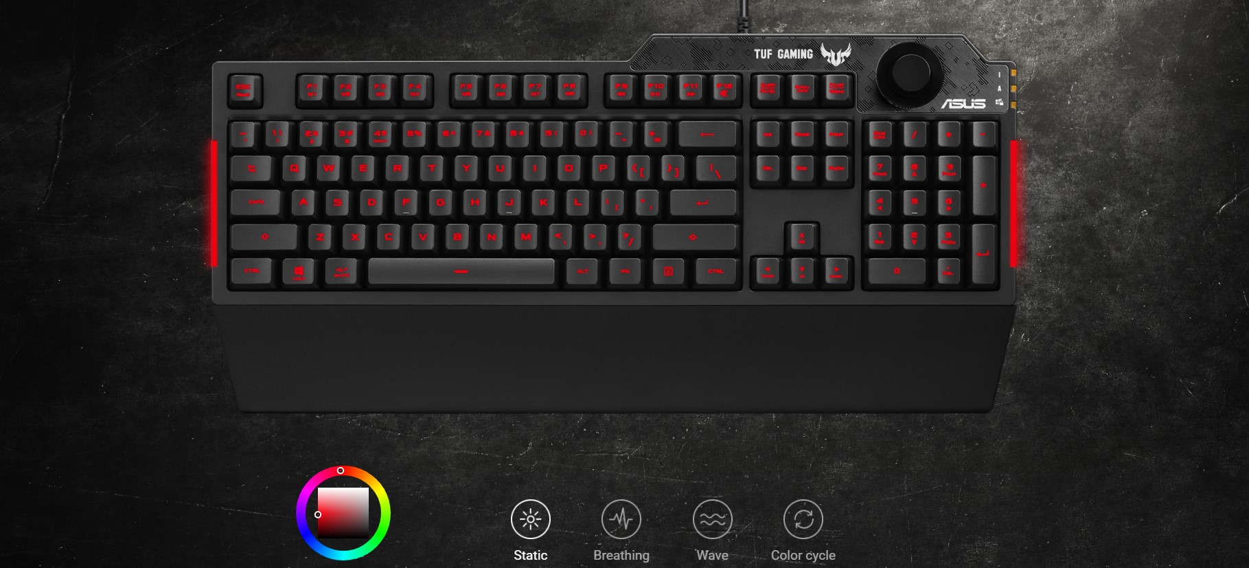 Cu un buton de volum dedicat în partea dreaptă-sus, TUF Gaming K1 face controlul din mers rapid și ușor pentru sunetul jocului. Poți să atingi și să rotești intuitiv, păstrându-ți ochii bine fixați pe acțiune.