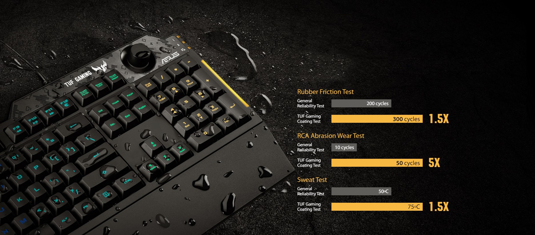 La interior și la exterior, TUF Gaming K1 este construit pentru a oferi ani de zile de serviciu în prima linie. Învelișul său exterior prezintă un strat specializat, fortificat pentru a rezista la o baterie de peste 10 teste stricte de abraziune, frecare și transpirație. Iar rezistența la răsturnări de până la 300 ml asigură că accidentele cu cutii sau pahare nu vor omorî acțiunea.