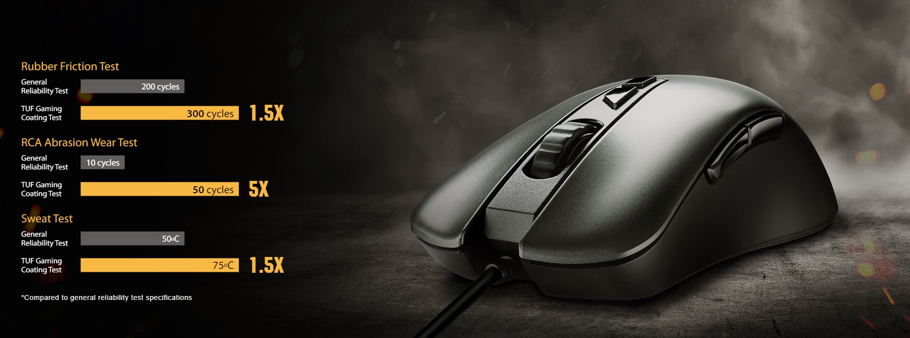 La interior și la exterior, TUF Gaming M3 este conceput pentru a oferi ani de serviciu în prima linie. Învelișul exterior prezintă un strat specializat, fortificat pentru a rezista la o baterie de peste 10 teste stricte de abraziune, frecare și transpirație. Pentru a ajuta raportul K/D în timpul bătăliei frenetice, butoanele critice folosesc comutatoare tactile care sunt evaluate pentru cel puțin 20 de milioane de clicuri, în timp ce baza dispune de picioare din teflon îmbunătățite pentru a menține mișcarea lină timp de nenumărate ore.