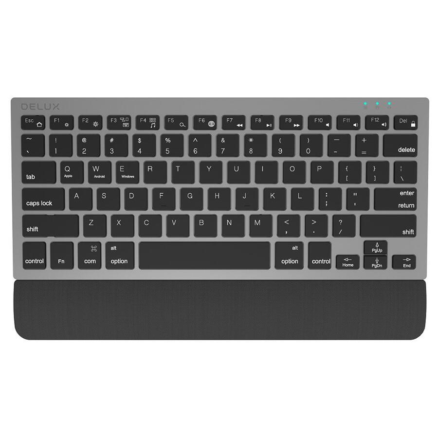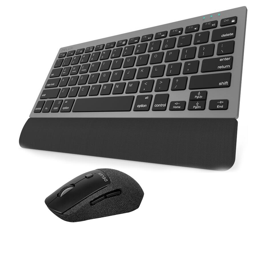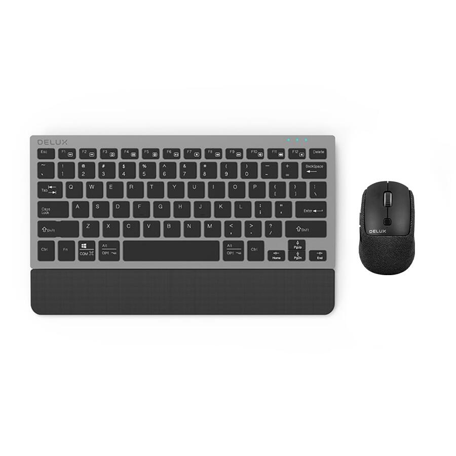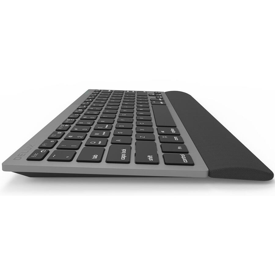 Kit tastatura si mouse bluetooth si wireless Delux K33000+M520DB negru, tastatura K3300D, 25 taste fara conflict (25-key rollover), 12 taste multimedia, numar butoane: 66, conectivitate: bluetooth sau 2.4Ghz, palmrest textil detasabil cu prindere magnetica, 3 moduri de utilizare: Apple / Android / Windows, dimensiuni tastatura: 287x168x18mm (cu palmrest) sau 287x126x18mm (fara palmrest), mouse M520DB: rezolutie mouse: 800-2400 DPI, numar butoane: 7, conectivitate: bluetooth sau 2.4Ghz, picioruse de teflon, conector mouse USB, dimensiuni mouse: 105x65x40mm