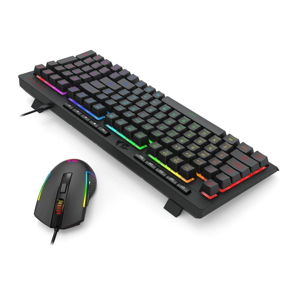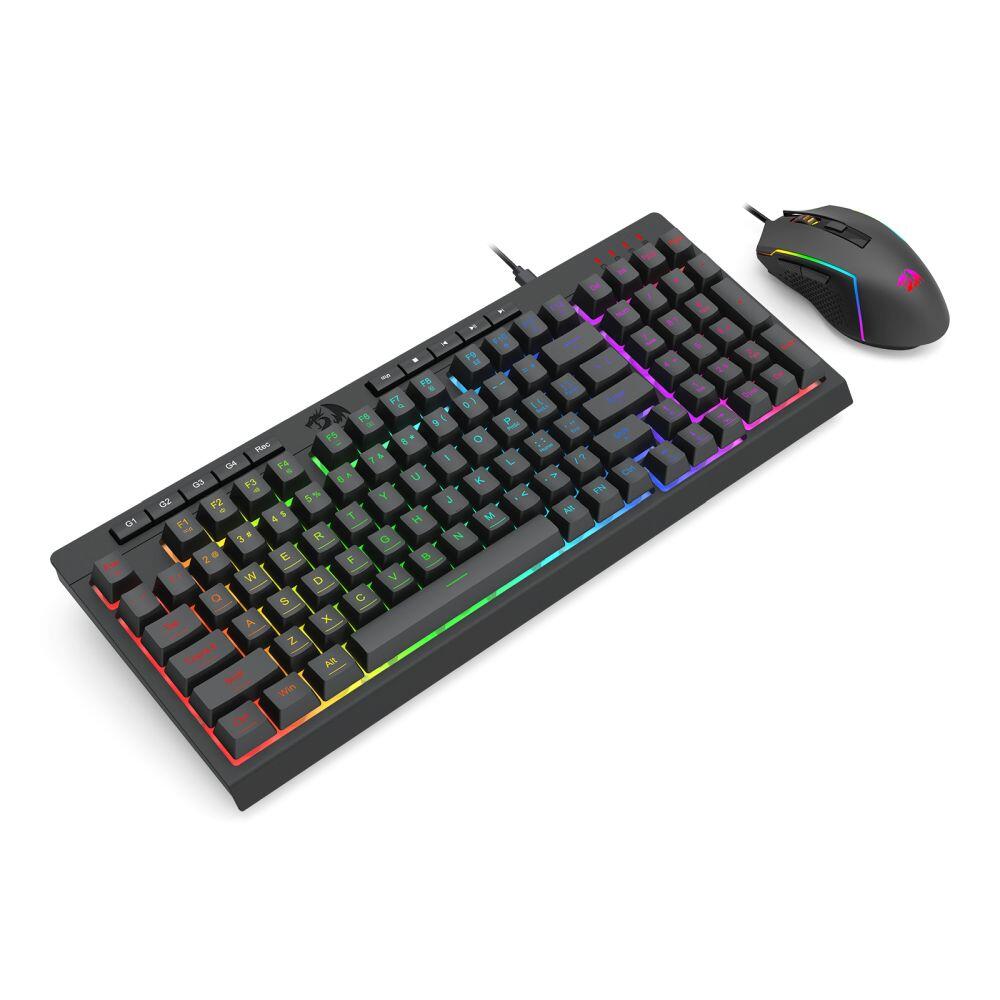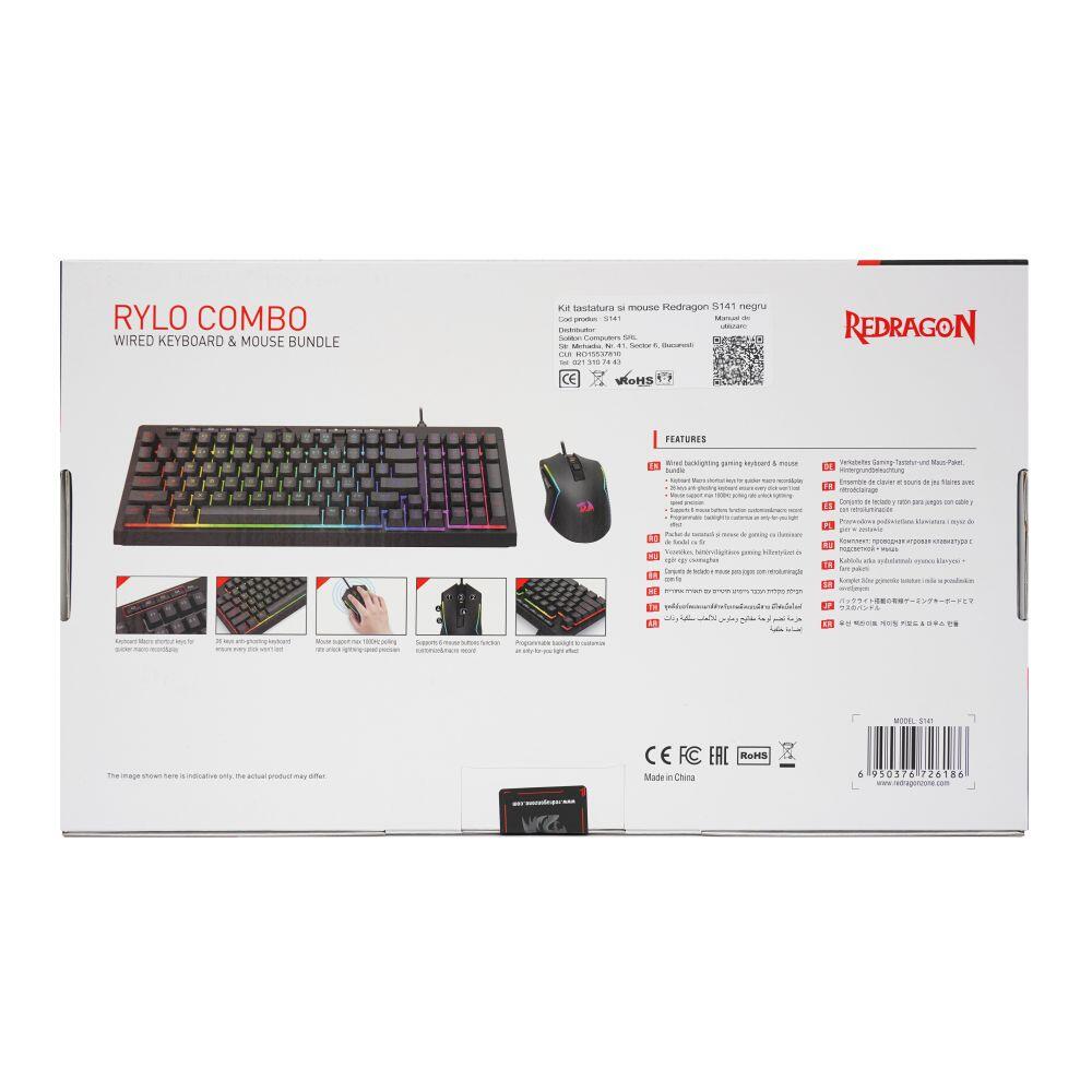 Kit tastatura si mouse Redragon S141 negru iluminare RGB, tastatura: 26 taste fara conflict (26-key rollover), iluminare LED RGB a tastelor, 9 taste multimedia, 4 butoane programabile, tasta WIN poate fi dezactivata in timpul jocurilor, conector USB, mouse: iluminare RGB, 4000 DPI, polling rate: 1000Hz, senzor optic, micro switch-uri Huano (durata de viata: 20 milioane click-uri), numar butoane: 6 (6 programabile), 7 moduri de iluminare (16 milioane de culori disponibile), picioruse de teflon, conector USB lungime cablu: 1.8m, conector USB