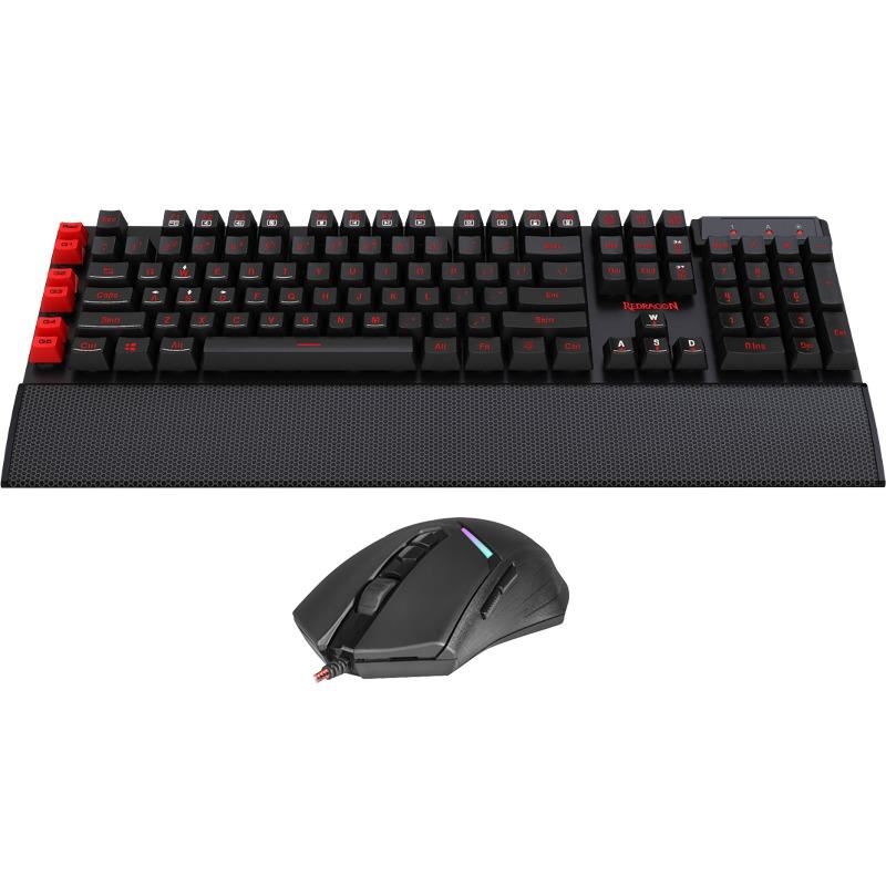 Kit tastatura si mouse Redragon Yaksa + Nemeanlion V2, 26 taste fara conflict (26-key rollover), iluminare LED a tastelor (7 culori disponibile: red, green, dark blue, yellow, light blue, purple, white, no light), 12 taste multimedia, 5 butoane programabile, tasta WIN poate fi dezactivata in timpul jocurilor, conector USB placat cu aur, rezolutie mouse: 7200 DPI, numar butoane: 8, iluminare LED RGB (3 moduri de iluminare), durata de viata a micro switch-urilor: 10 milioane de click-uri, picioruse de teflon, conector USB placat cu aur, lungime cablu: 1.8m, dimensiuni mouse: 124x74x39mm, greutate: 130g, USB