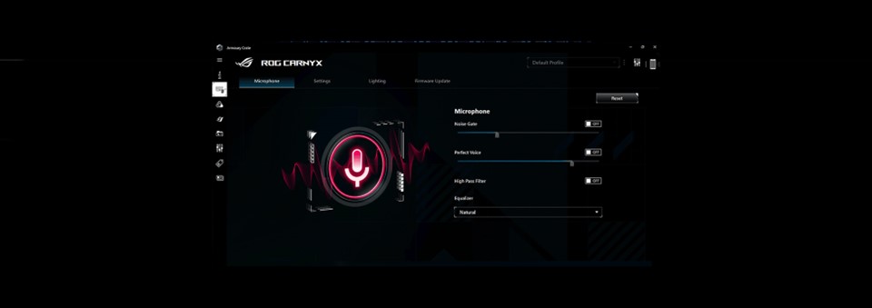 Folosiți Armoury Crate pentru a activa filtrul de trecere înalt, pentru a personaliza profilurile de egalizare, pentru a regla iluminarea RGB sau pentru a accesa alte setări ale dispozitivului.