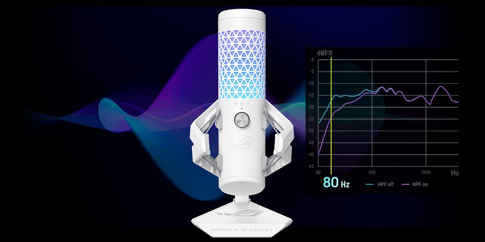 Filtrul integrat elimină zgomotele de fond nedorite de joasă frecvență sub 80 Hz, cum ar fi bufniturile sau bâzâiturile, acest lucru împiedică vocea ta să sune confuză și o ajută să iasă în evidență.