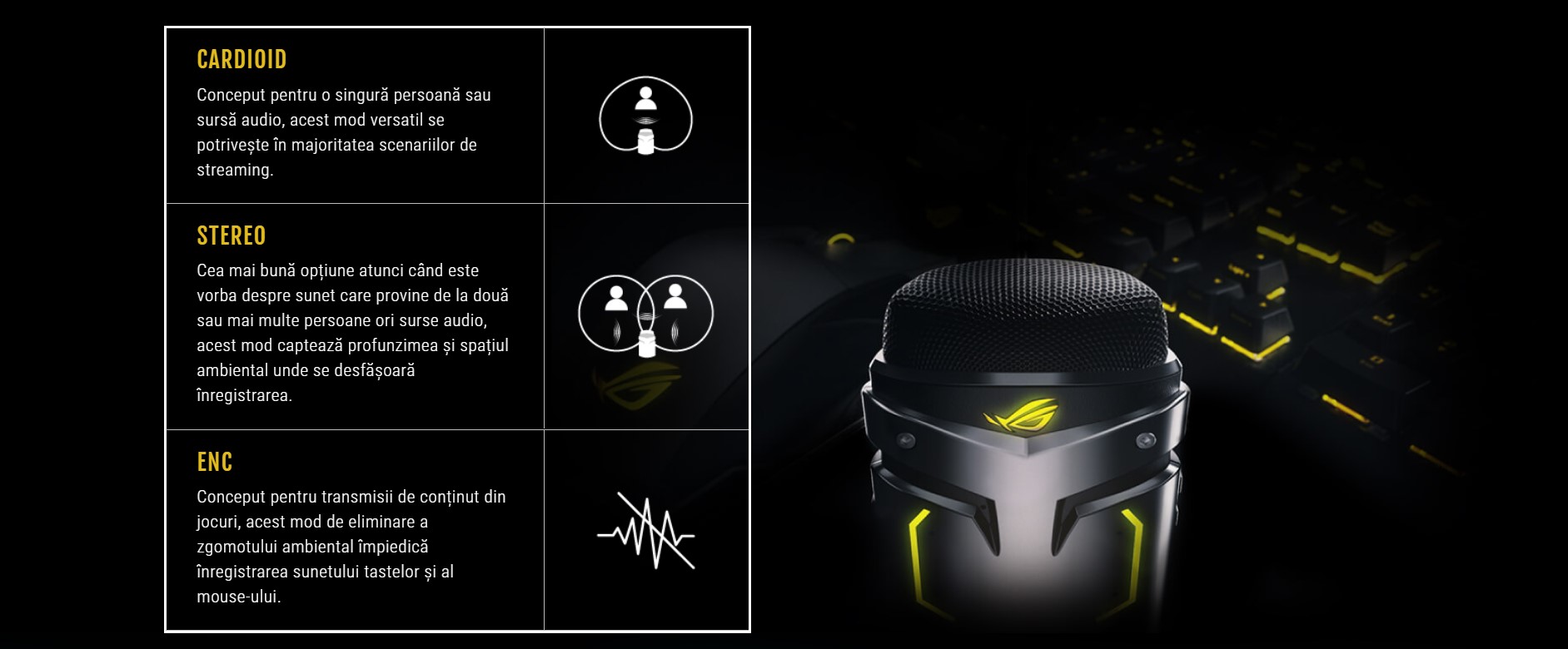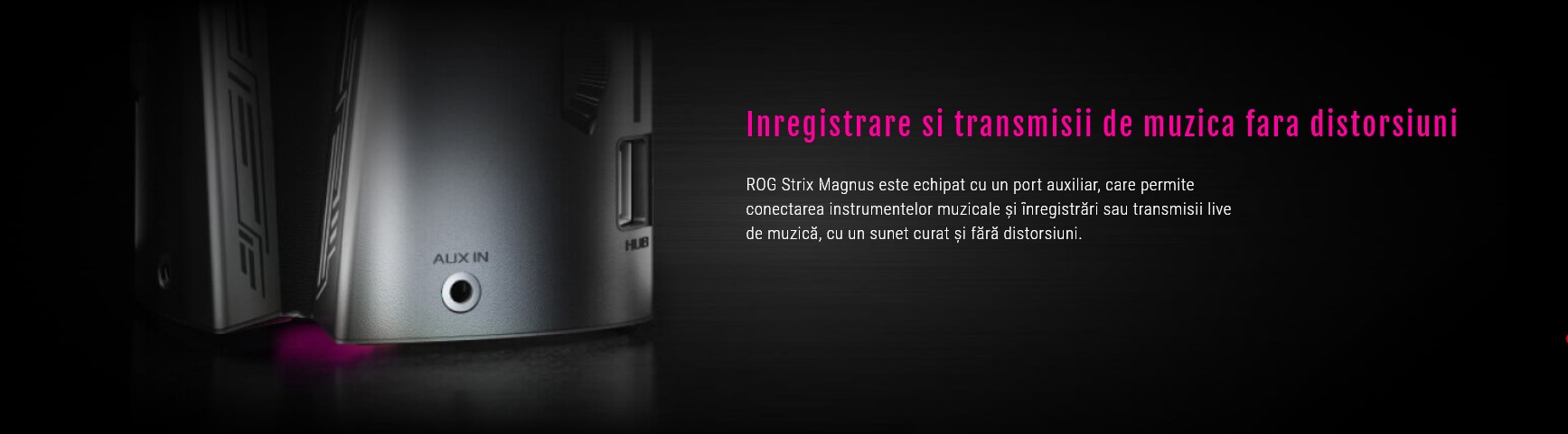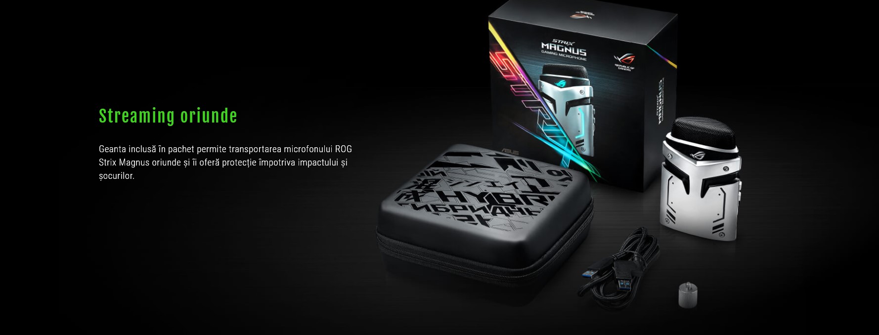 ROG Strix Magnus este primul microfon conceput special pentru pasionatii de jocuri care creeaza continut. El este prevazut cu trei capsule de condensator cu calitate de studio pentru o calitate perfecta a inregistrarii, tehnologie de eliminare a zgomotului ambiental (ENC), un design compact si solutie de iluminare AURA RGB. Prin toate acestea ROG Strix Magnus surclaseaza microfoanele traditionale si te ajuta sa oferi audientei continut la cea mai buna calitate.
