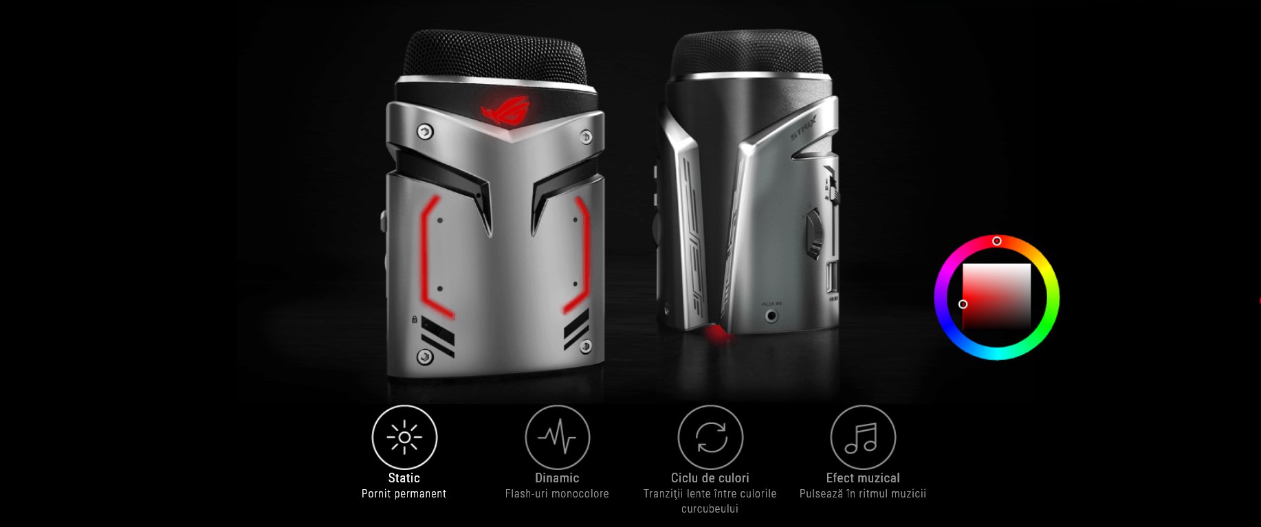 ROG Strix Magnus este primul si singurul microfon cu efecte luminoase RGB. Poti alege din 16.8 milioane combinatii de culori si patru efecte luminoase care sa delecteze audienta.