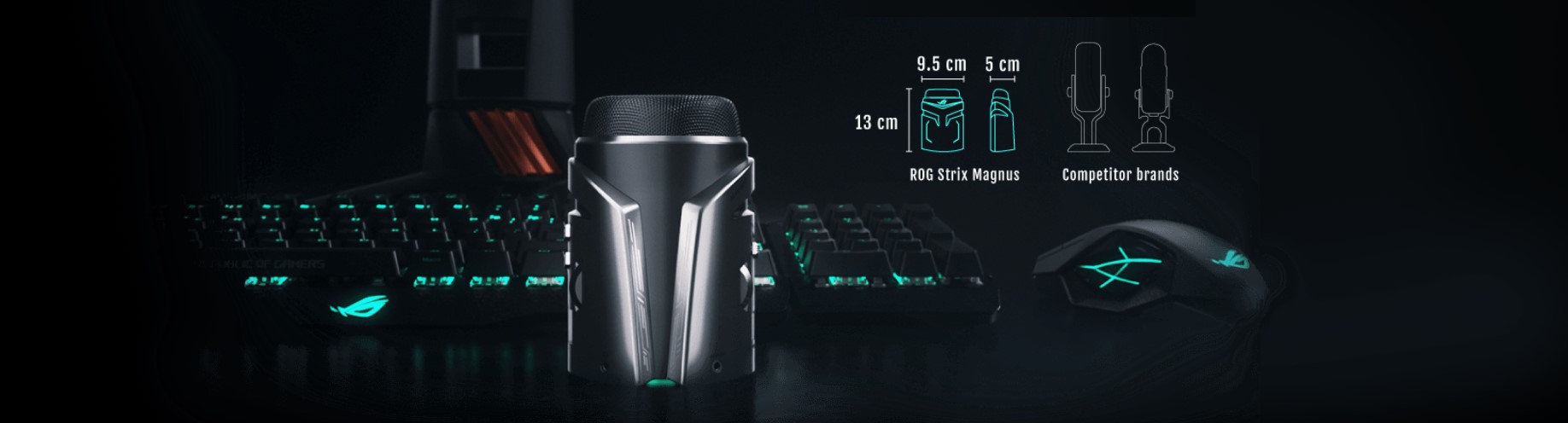 Conceput special pentru transmisii de continut din jocuri, ROG Strix Magnus are un design compact, cu 50% mai mic decat alte microfoane pentru jocuri populare, astfel ca incape in spatele tastaturii fara sa blocheze vizualizarea ecranului. Designul conceput pentru a economisi spatiu – construit dupa cercetari intensive despre ecosistemele desktop si despre scenariile de utilizare – elimina nevoia de stative voluminoase sau sisteme de fixare in perete care te-ar putea incomoda, iar astfel te vei pute concentra mai bine la transmisia live si la competitie.