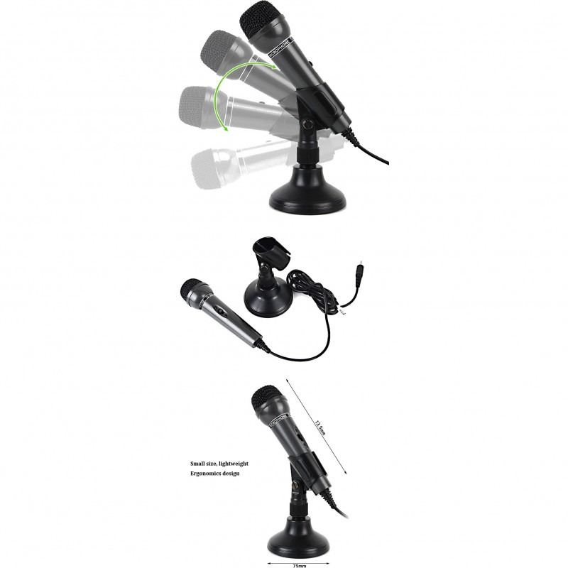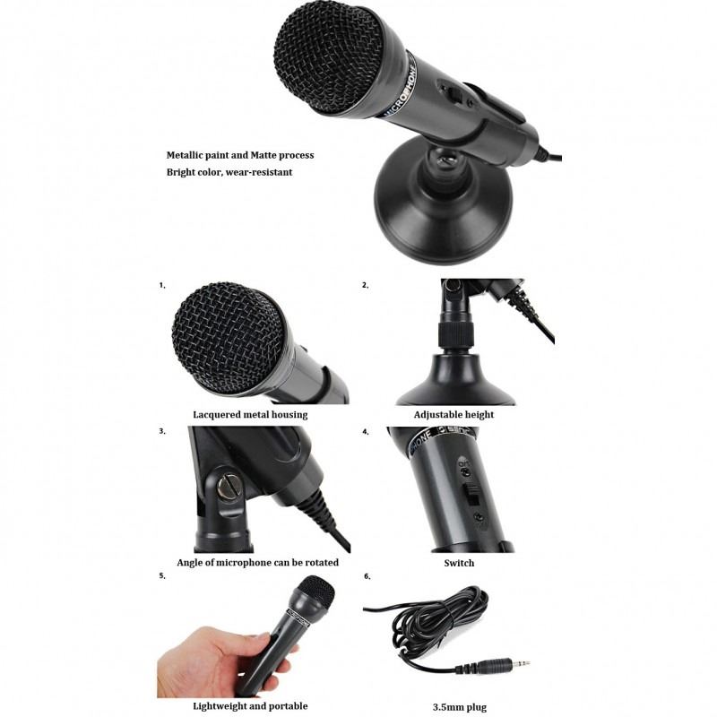 Senicc SM-098, microfon omnidirectional (dimensiuni: ∅9.7x6.7mm, sensibilitate: -58dB, impedanta: 2.2KΩ, S/N ratio: >60dB, Vsensibilitate reduction: -3dB la 1.5V, operation voltage: 4.5V), include stativ, lungime cablu: 2.2m, conectori: 1x jack TRS 3.5mm, greutate: 170g