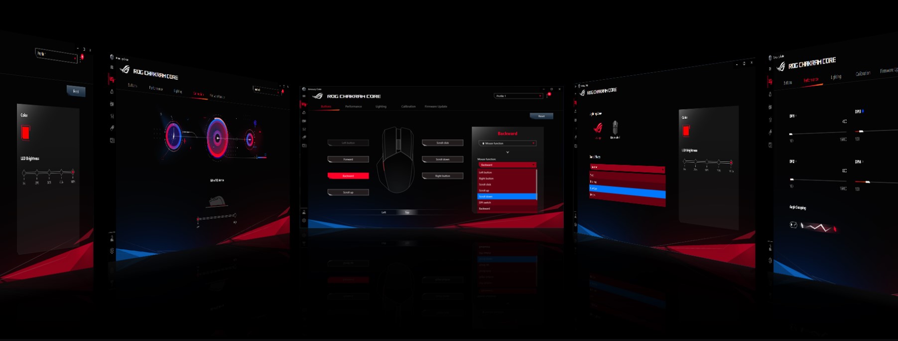 Armoury Crate este un utilitar îmbunătățit de configurare a perifericelor pe bază de driver, care oferă o mulțime de opțiuni de control. O interfață intuitivă îți permite să reglezi cu ușurință ROG Chakram Core pentru a se potrivi stilului tău de joc – poți ajusta setările pentru performanță și calibrarea suprafețelor, poți programa și mapa butoane, poți seta intrarea joystick-ului, poți personaliza efectele de iluminare și altele. Poți chiar să urmărești în timp real statisticile hardware ale sistemului în timp ce te joci.