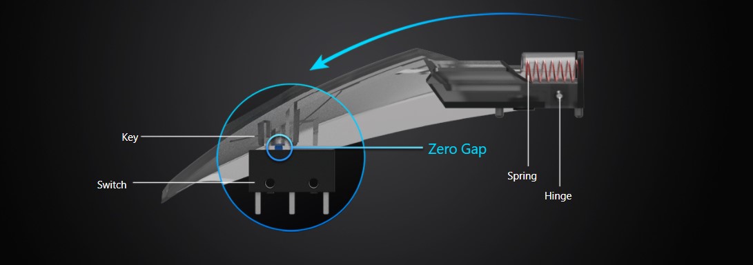 Cursa mai scurtă înseamnă click-uri mai rapide, motiv pentru care inginerii ROG au echipat ROG Chakram Core cu butoane pivotante. Mecanismul utilizează arcuri și balamale metalice pentru a echilibra butoanele și pentru a minimiza distanța dintre butoane și comutatoare. Avantajul este o cursă minimală și o reîntoarcere rapidă, ceea ce asigură o viteză superbă, sensibilitate și consistență la fiecare click.