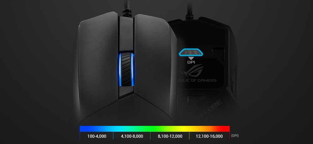 Funcția DPI On-The-Scroll a lui ROG Chakram Core îți permite să ajustezi ușor precizia mouse-ului, fără a avea nevoie de software pentru asta. Apasă și menține apăsat butonul DPI și apoi rotește rotița de scroll pentru a seta nivelurile de senzitivitate, mai jos pentru a ochi mai precis în jocuri sau mai sus pentru a defila mai rapid pe ecran. Luminile de pe Chackram Core se vor schimba pentru a indica nivelul DPI curent. Apasă din nou butonul DPI pentru a bloca senzitivitatea.