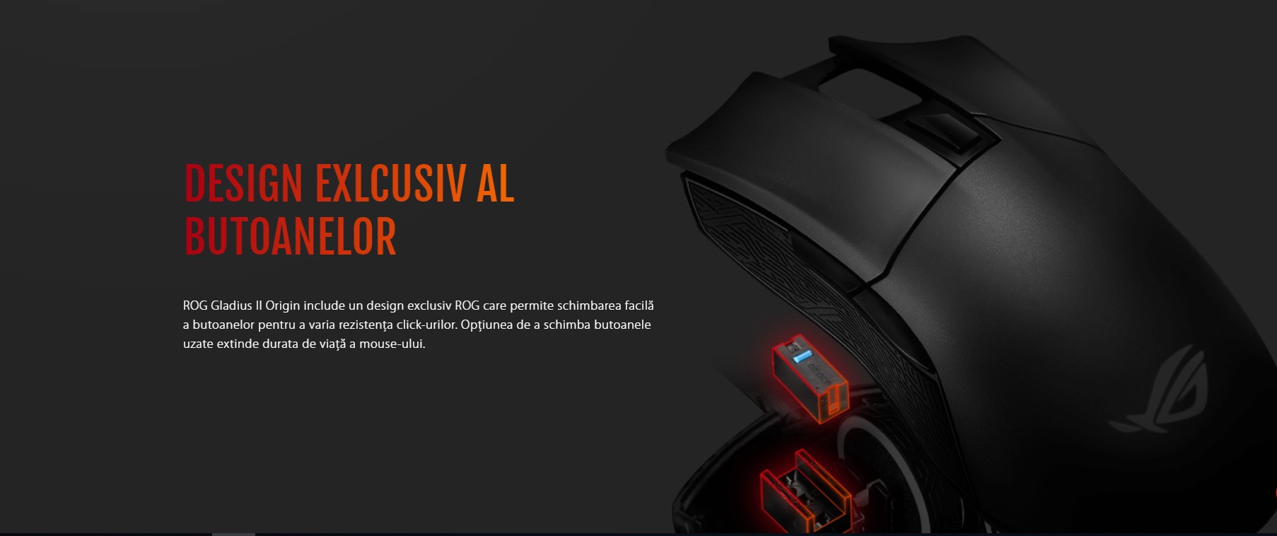 - Suporturi pentru switch-uri cu design exclusiv ROG care permite varierea presiunii click-urilor și extinderea duratei de viață a mouse-ului