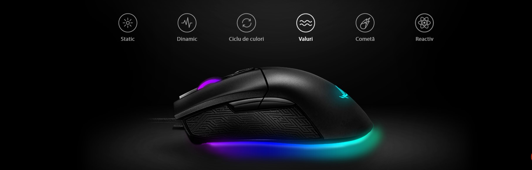 Notă: Sincronizarea iluminării între mouse-ul ROG și tastatură este activată și controlată prin software-ul ROG Armory. Sincronizarea cu plăcile de bază ASUS, plăcile video, perifericele și alte componente este activată și controlată prin software-ul propriu ASUS Aura.