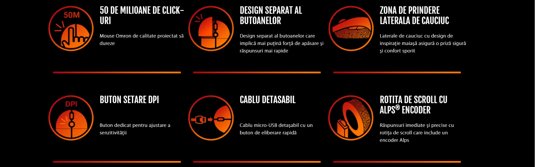 - Butoanele Omron oferă o durabilitate de 50 de milioane de clickuri, iar cele două butoane Omron extra, realizate în Japonia, cu o rezistență diferită la clickuri