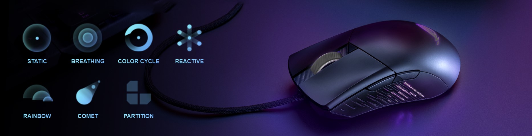 Logo-ul ROG, rotița de scroll și marcajele ROG din lateralul lui ROG Gladius III dispun de iluminare RGB integrată ROG Aura. Panoul lateral gravat cu laser oferă, de asemenea, efecte speciale de pâlpâire care pot fi personalizate cu culoarea pe care o preferi.
