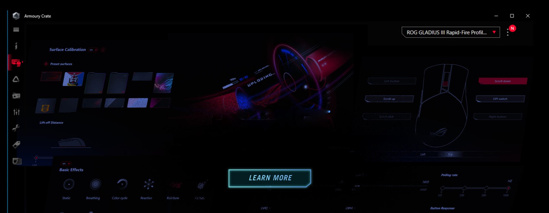 Armoury Crate îți permite să reglezi ușor ROG Gladius lll pentru a se potrivi cu stilul tău de joc. Ajustează setările de performanță și cele de calibrare a suprafeței, programează și mapează butoane, personalizează efectele de iluminare și multe altele.