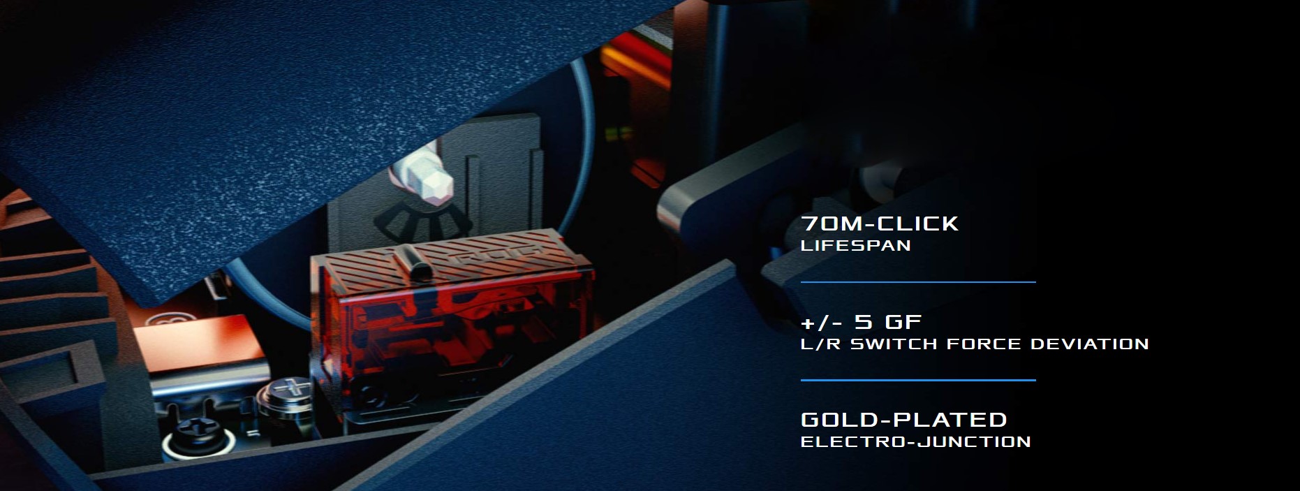 Noile ROG Micro Switches au o durată de viață de 70 de milioane de clicuri și o electro-joncțiune placată cu aur pentru a îmbunătăți durabilitatea. Standardele stricte de producție ale ROG asigură faptul că fiecare comutator individual este inspectat și sortat, comutatoarele stânga și dreapta fiind împerecheate pentru a se menține o deviație a forței în limita a +/- 5 grame-forță, pentru o senzație consistenta a clicului.
