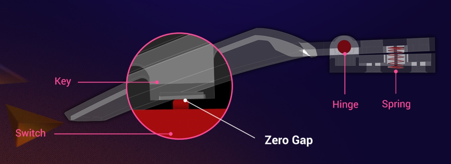 Acest mecanism unic minimizează distanța dintre butoane și comutatoare pentru un răspuns aproape instantaneu al clicului.