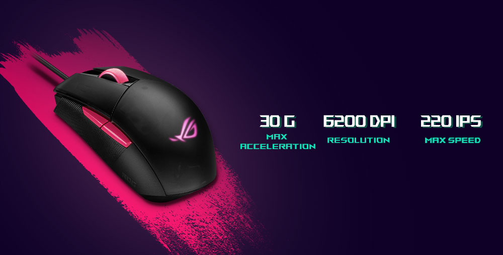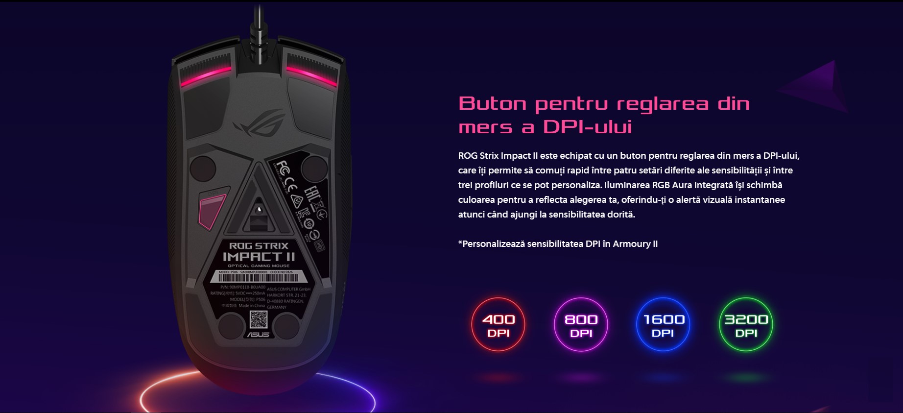 La proiectarea lui ROG Strix Impact II Electro Punk am colaborat cu jucători profesioniști, rezultatul fiind o ergonomie ambidextră, optimizată pentru jocuri performante și o priză confortabilă, cu un corp de numai 79 de grame. Senzorul de 6.200 dpi urmărește până la 220 ips cu o rată de eșantionare de 1.000 Hz, așa că ți se oferă o precizie sporită, un răspuns rapid și un control precis - totul fără nicio latență. Impact II include chiar și cinci butoane programabile, care îți permit un control personalizat al jocului sau un stil aparte de joc.