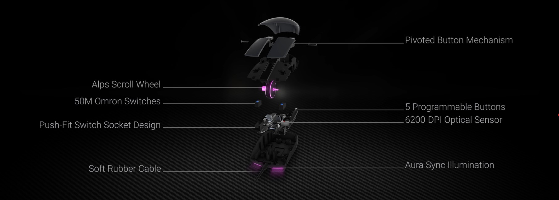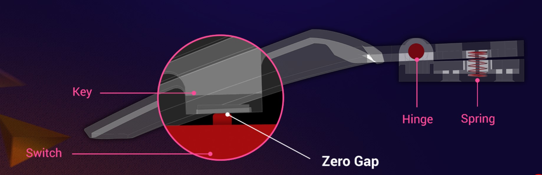 O cursă mai scurtă înseamnă un click mai rapid, motiv pentru care inginerii noștri au echipat ROG Strix Impact II Electro Punk cu butoane pivotante. Mecanismul utilizează arcuri și balamale metalice pentru a echilibra tastele și minimizează distanța dintre butoane și switch-uri. Avantajul este cursa minimală și întoarcerea rapidă a butonului, ceea ce asigură o viteză superbă, sensibilitate și consistență la fiecare click.