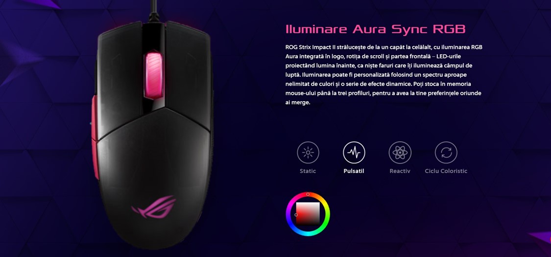 Mouse Gaming ASUS ROG Strix Impact II Electro Punk, ambidextru, RGB, conectivitate cu fir, senzor 6.200 dpi, iluminare Aura Sync