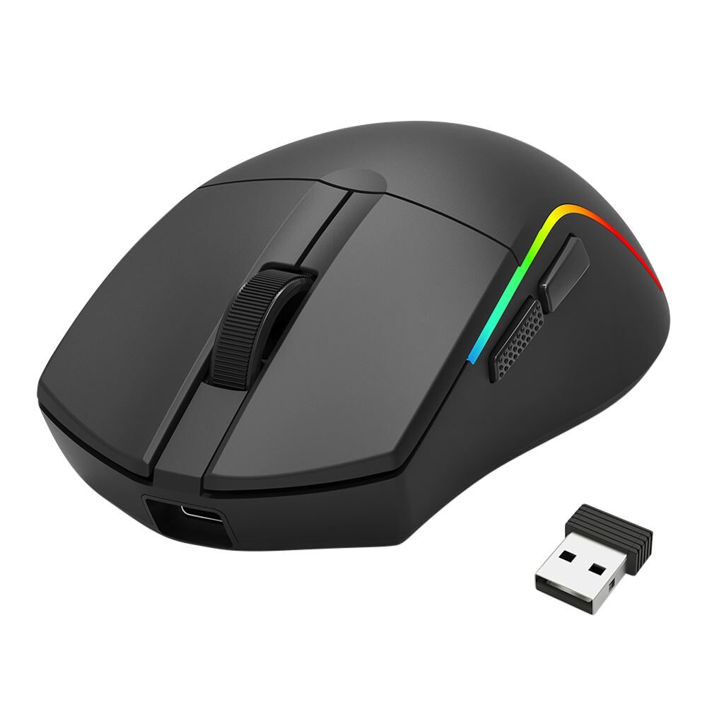 Mouse gaming Bluetooth cu si fara fir Redragon Deicide Standard negru iluminare RGB, 24000 DPI, senzor optic Pixart 3313, micro switch-uri Huano albastre, numar butoane: 5, iluminare RGB, conectare wireless si Bluetooth, acumulator: 700mAh, picioruse de teflon, conector USB Type-C, lungime cablu: 1.8m, dongle USB, cablu detasabil, dimensiuni: 122x66x40mm, greutate: 62g (fara cablu)
